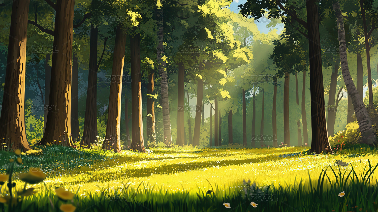 阳光照射森林插画背景海报装饰画背景