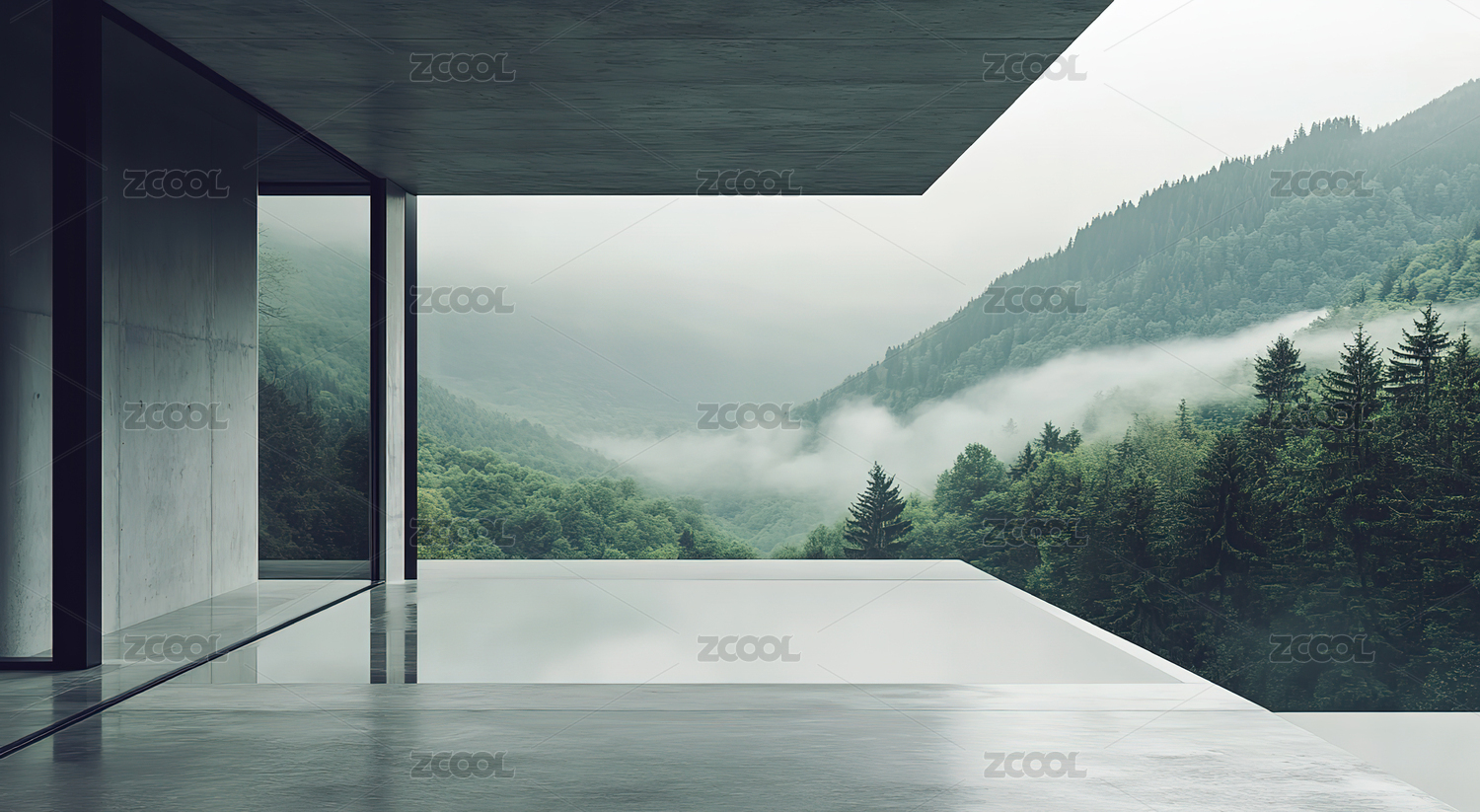 落地窗建筑内部大理石展厅带办公桌沙发窗外