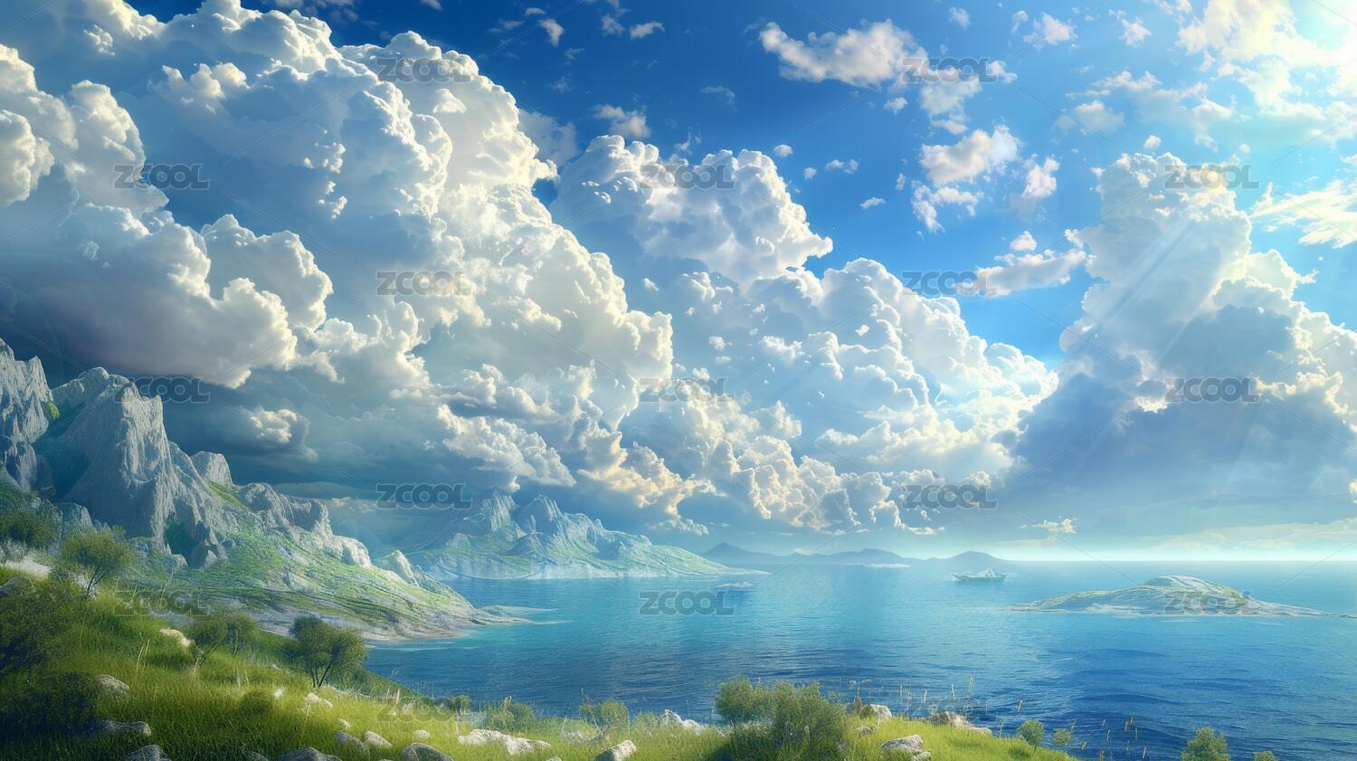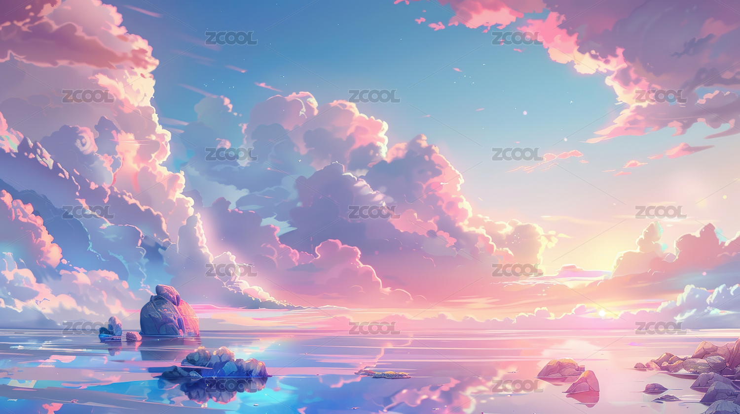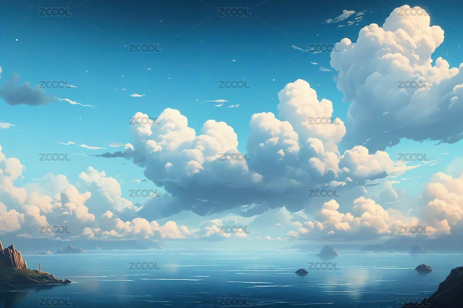 夏天海滩云朵梦幻海岸尽管旅行自然风景插画