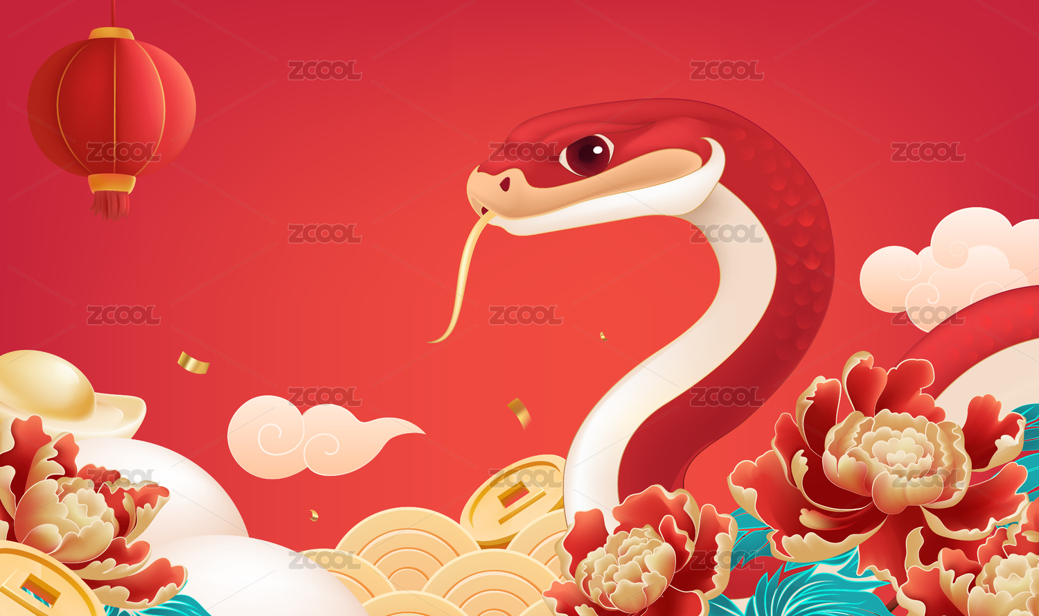 红色春节背景设计红色的蛇在牡丹花丛中