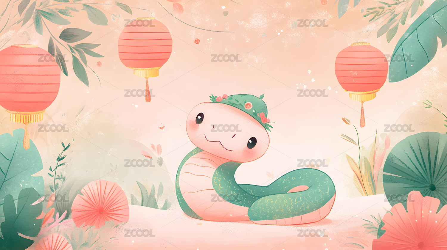 多巴胺色系扁平风格蛇年插画