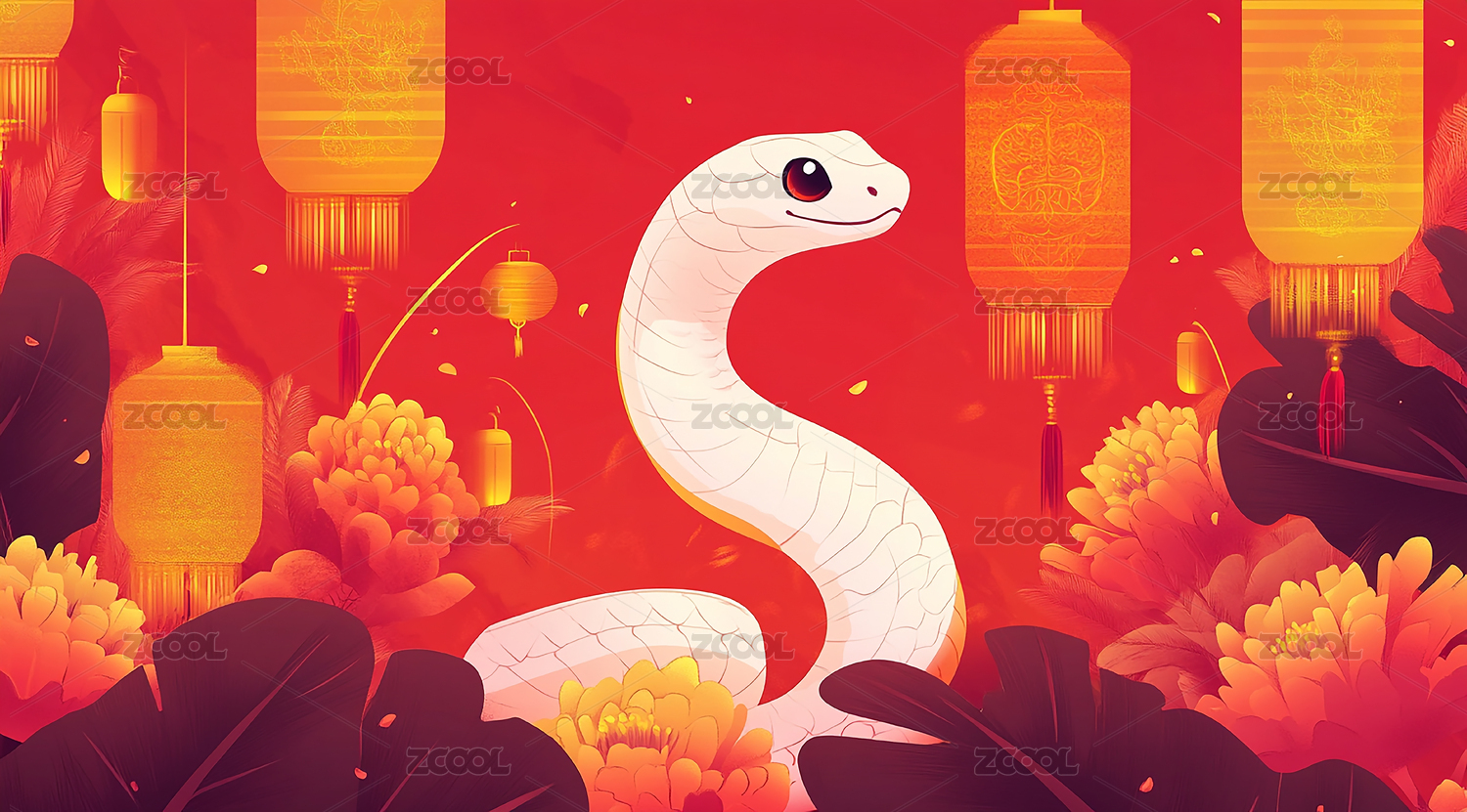 红色喜庆背景上的白色小蛇