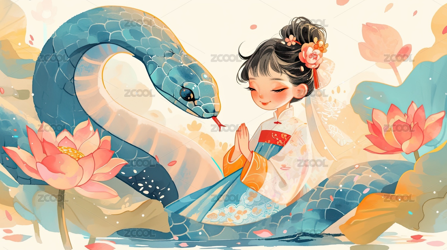 穿汉服的女孩和中国蛇