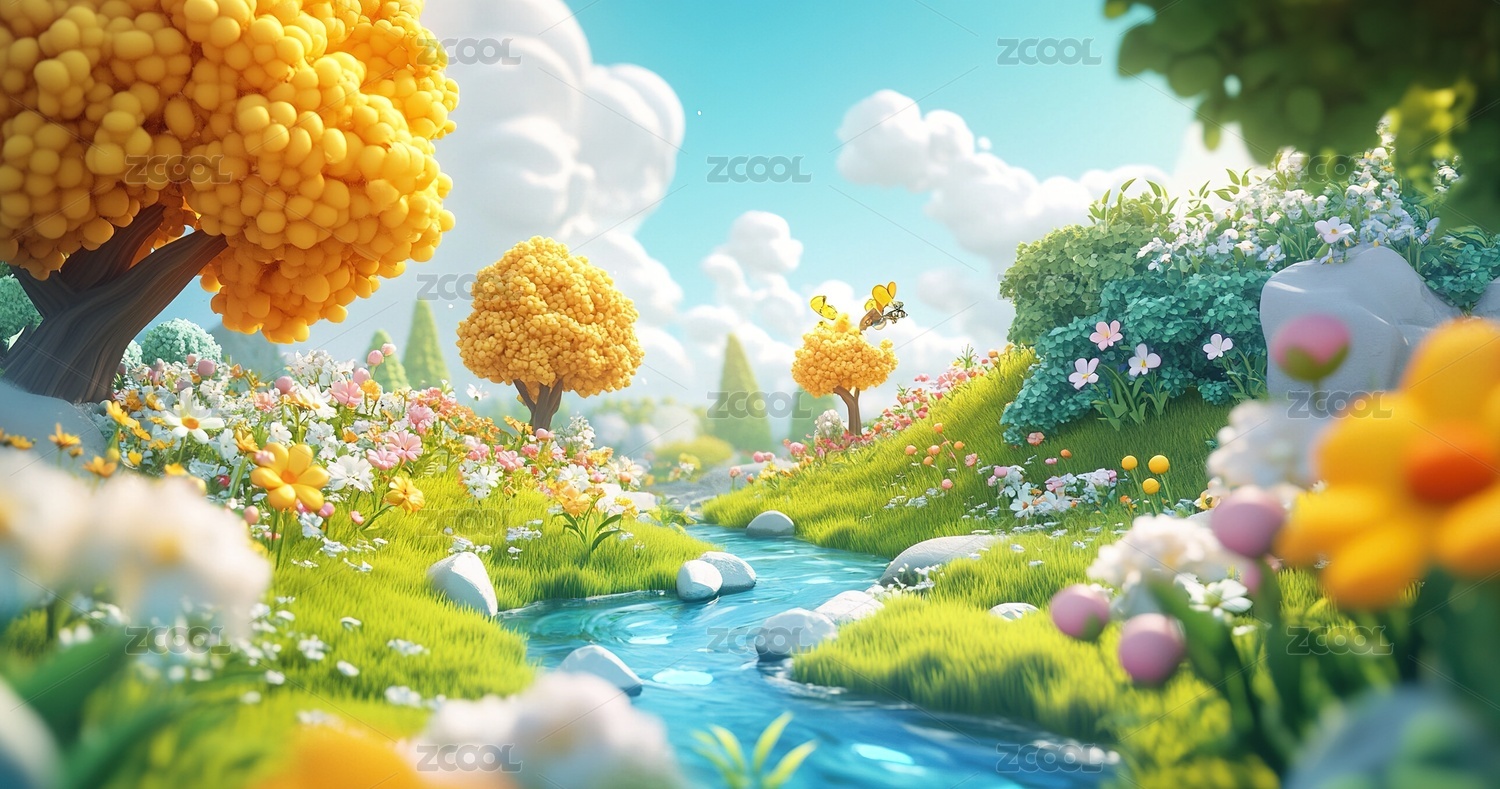 梦幻般卡通风格田园风光溪流
