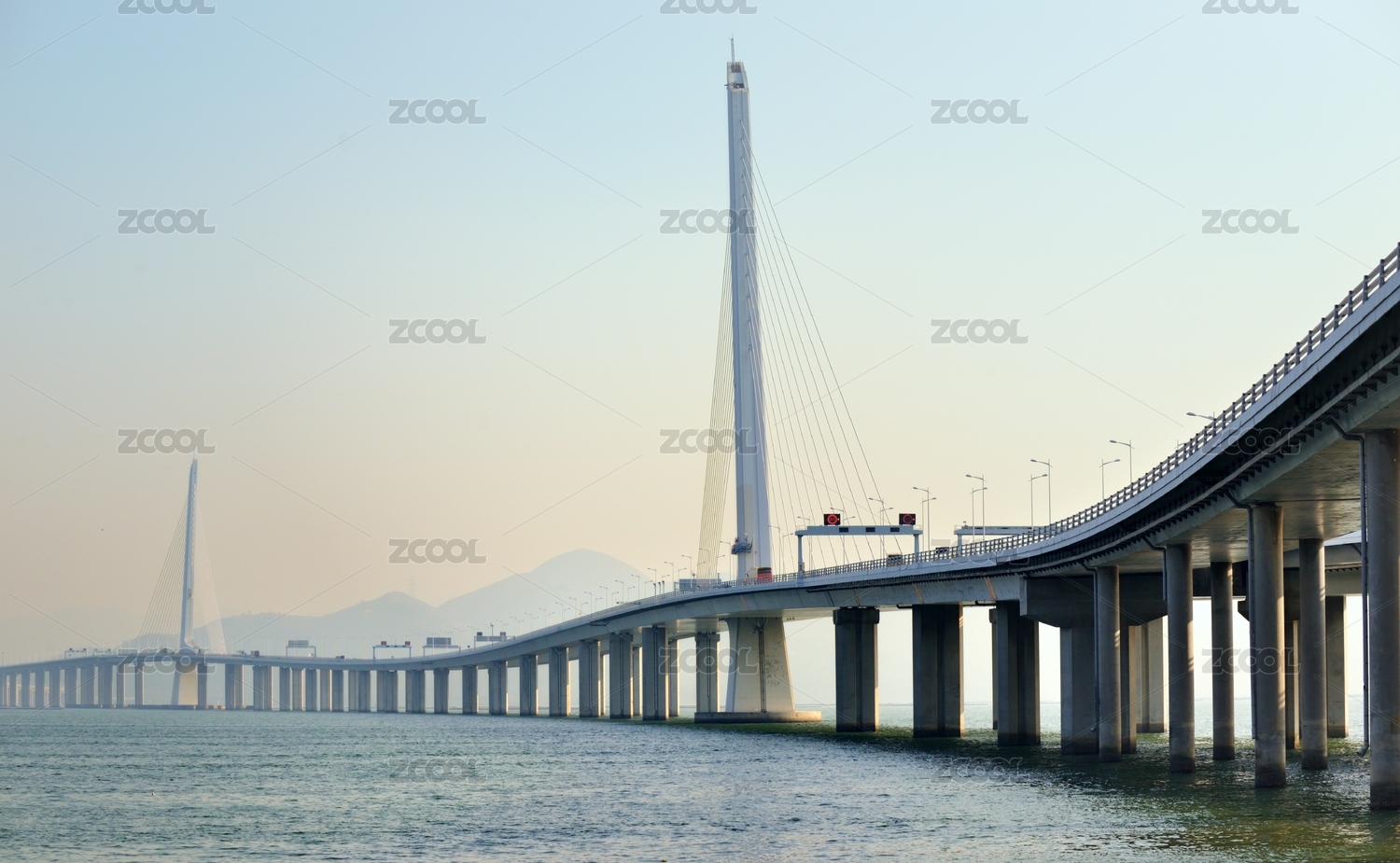 晴天傍晚的蓝色的深圳湾天空和浅蓝色的海面