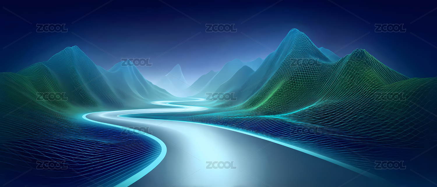 山路,河流,曲线,山峰,绿色,蓝色,天空,远景,透视,渐变