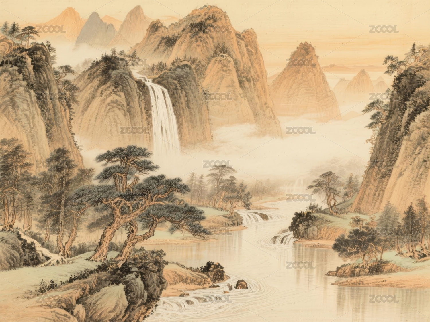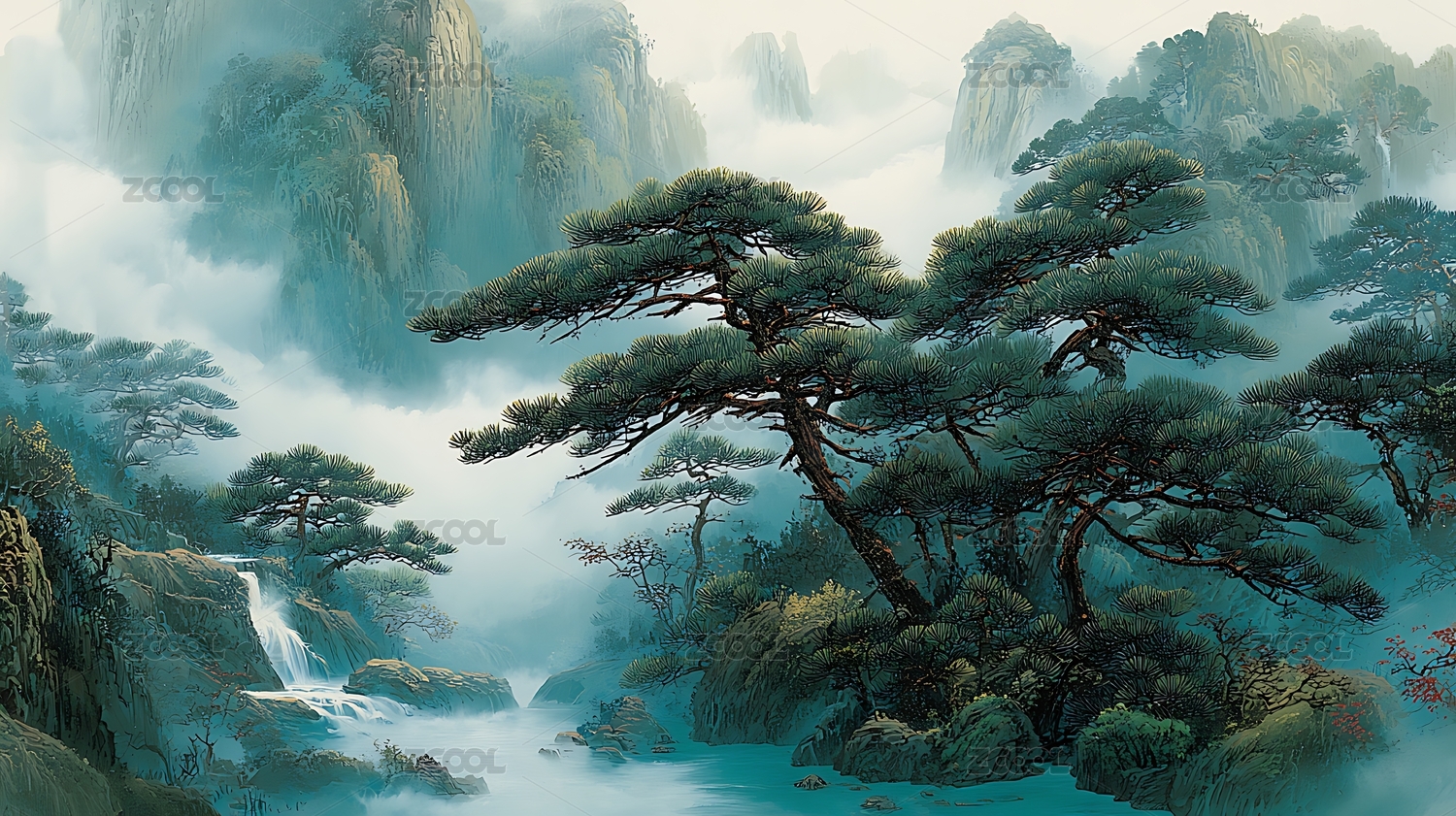 黑白中国风水墨风山水画,手绘国风意境水墨