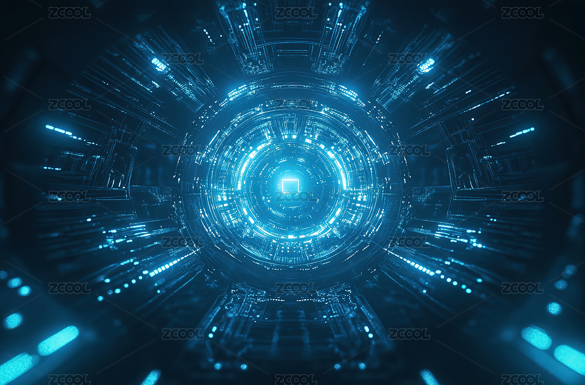 3D渲染的科幻延伸背景,几何隧道和霓虹灯