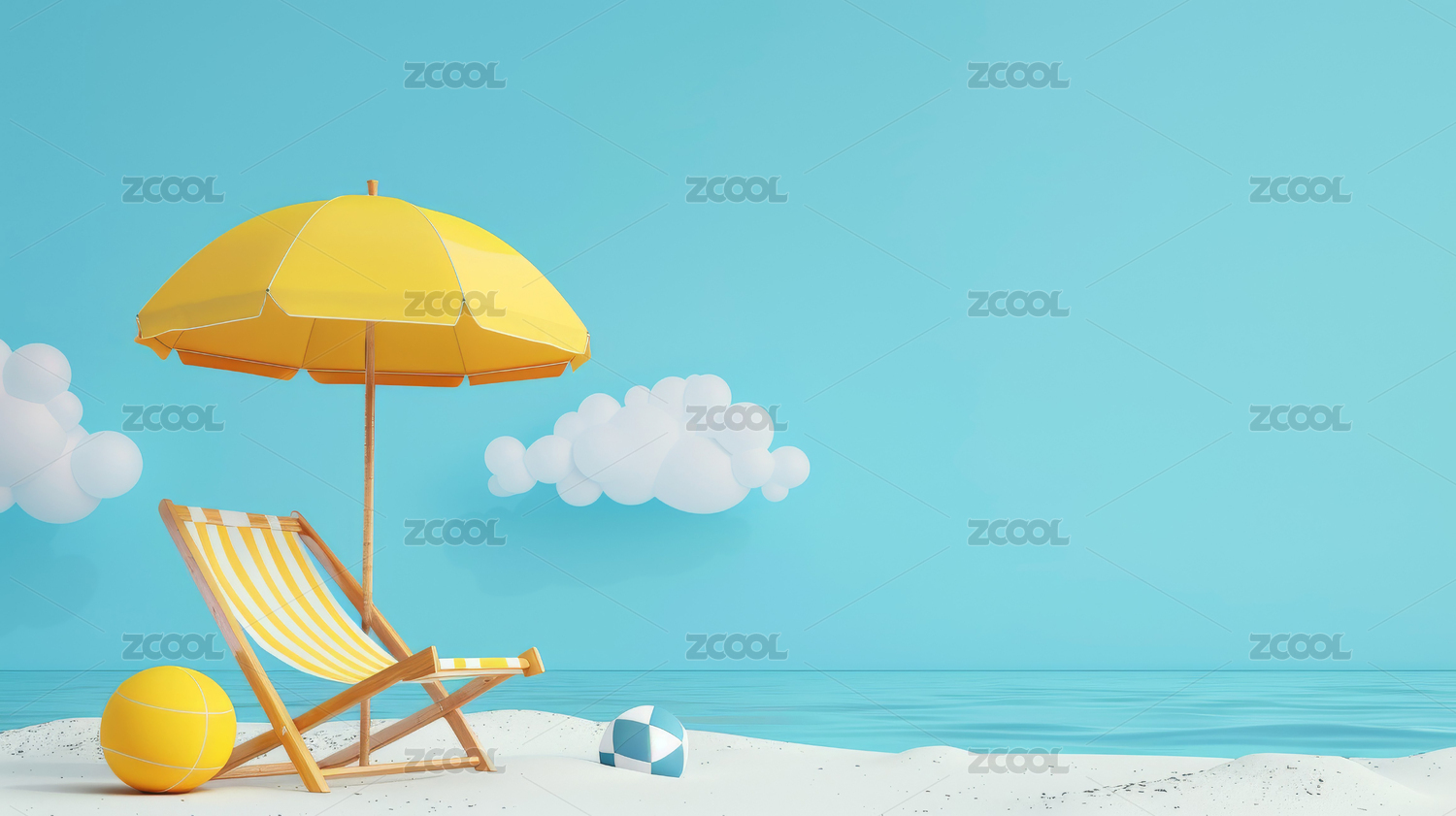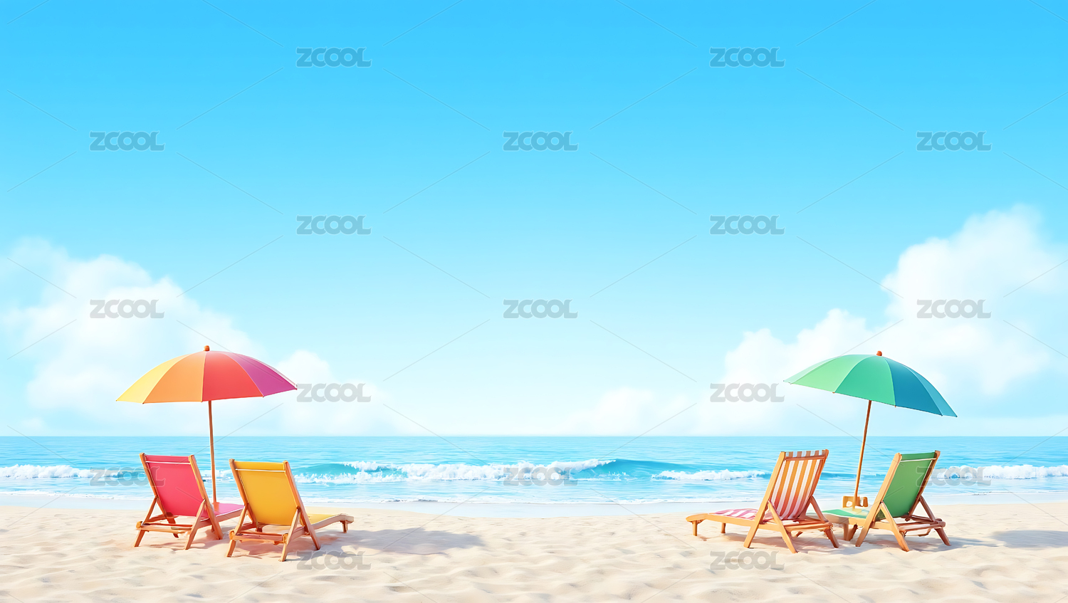 蓝天白云下沙滩上放着沙滩椅和遮阳伞