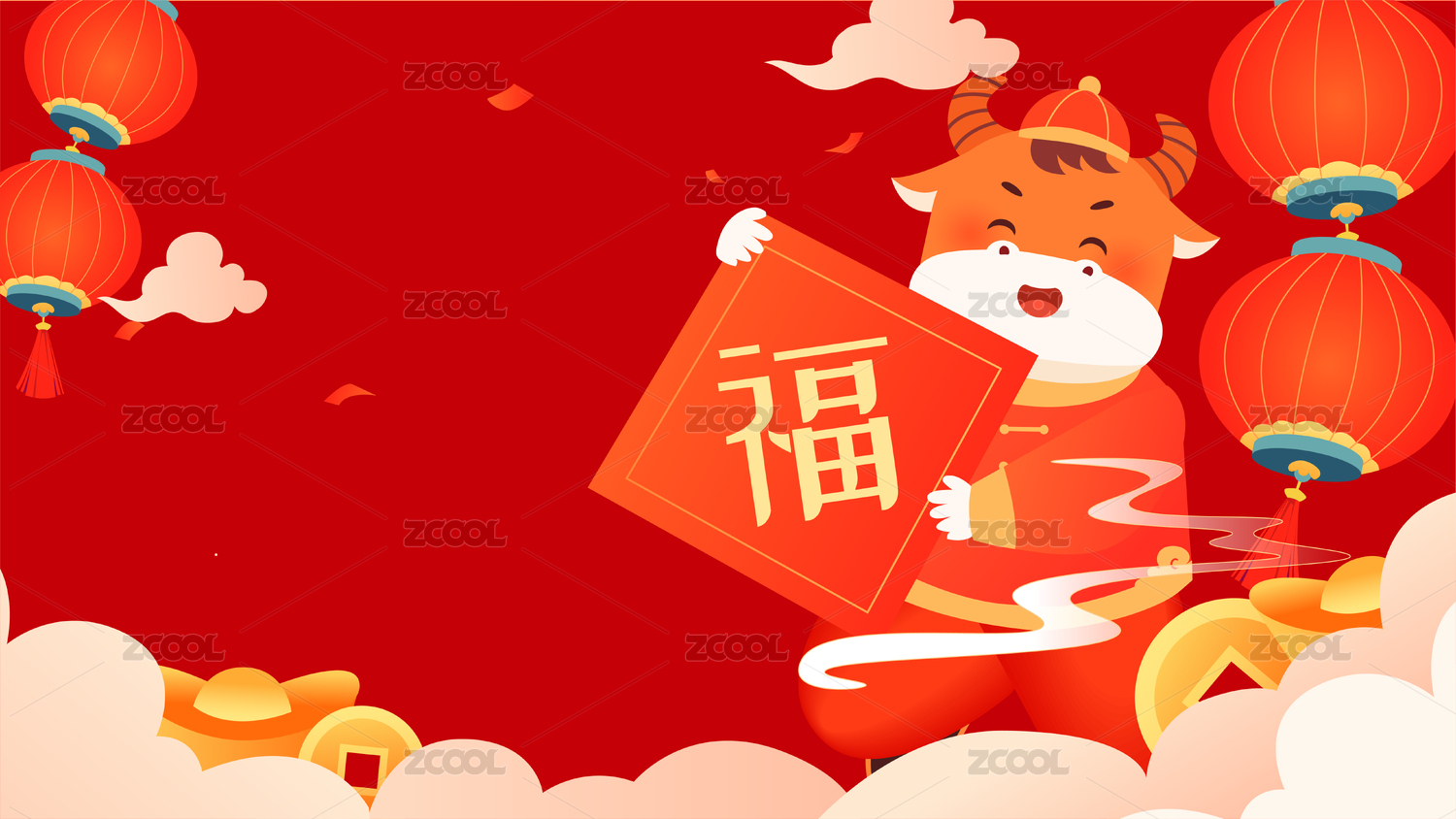 新年2021年牛年春节,牛在舞狮庆祝节日