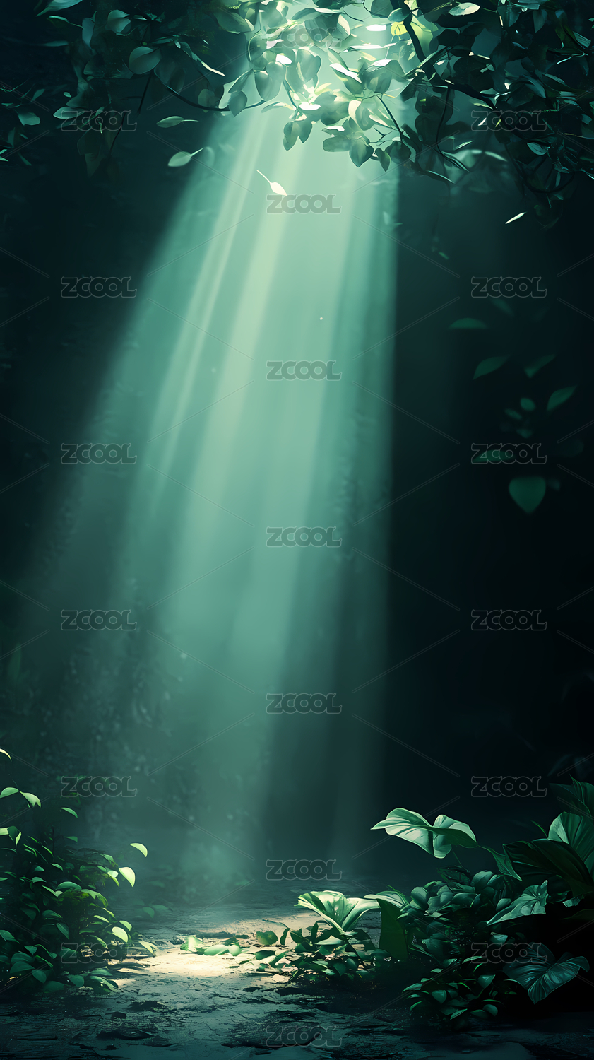 神秘森林中的光斑与树叶