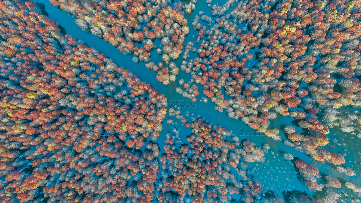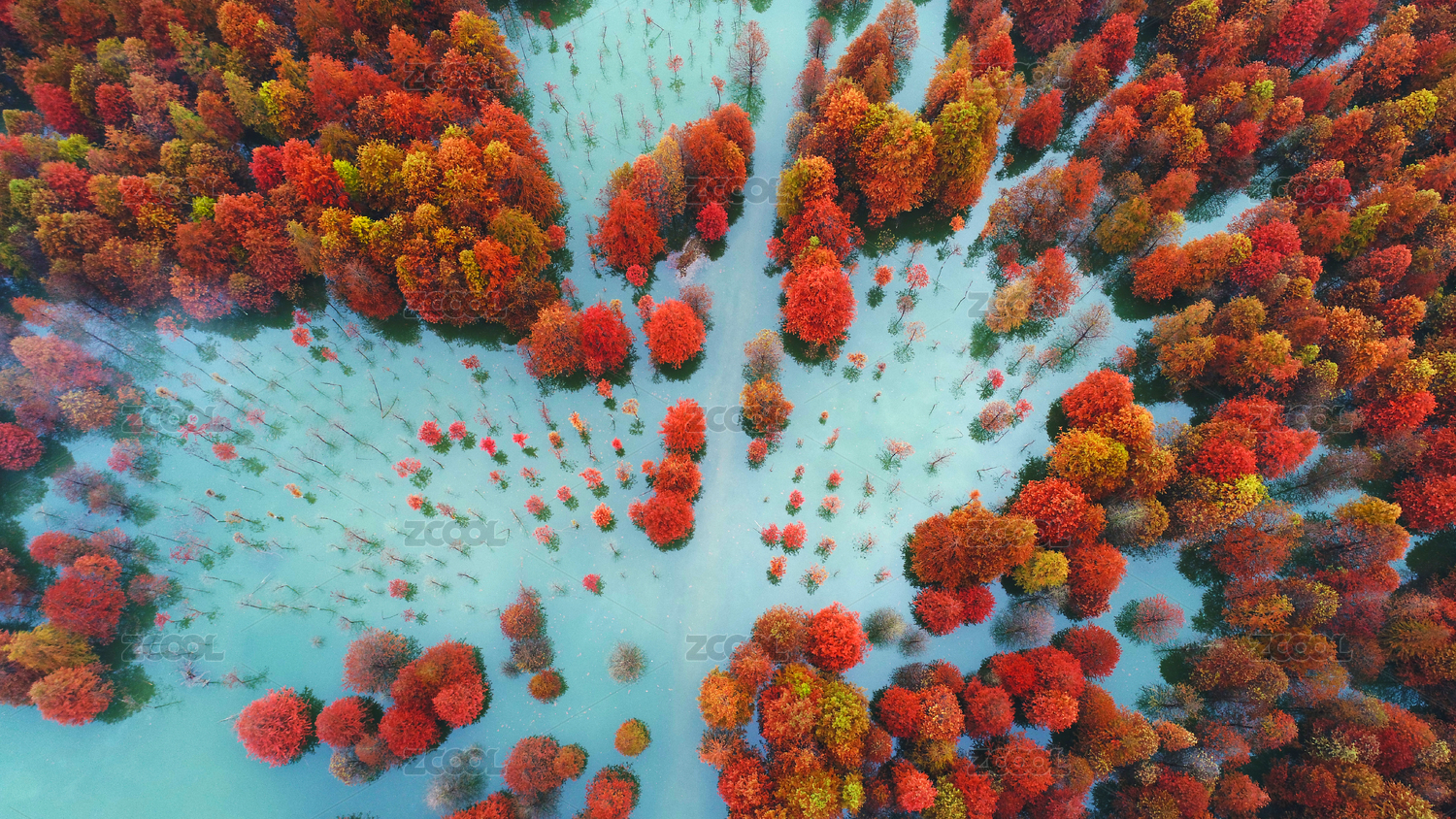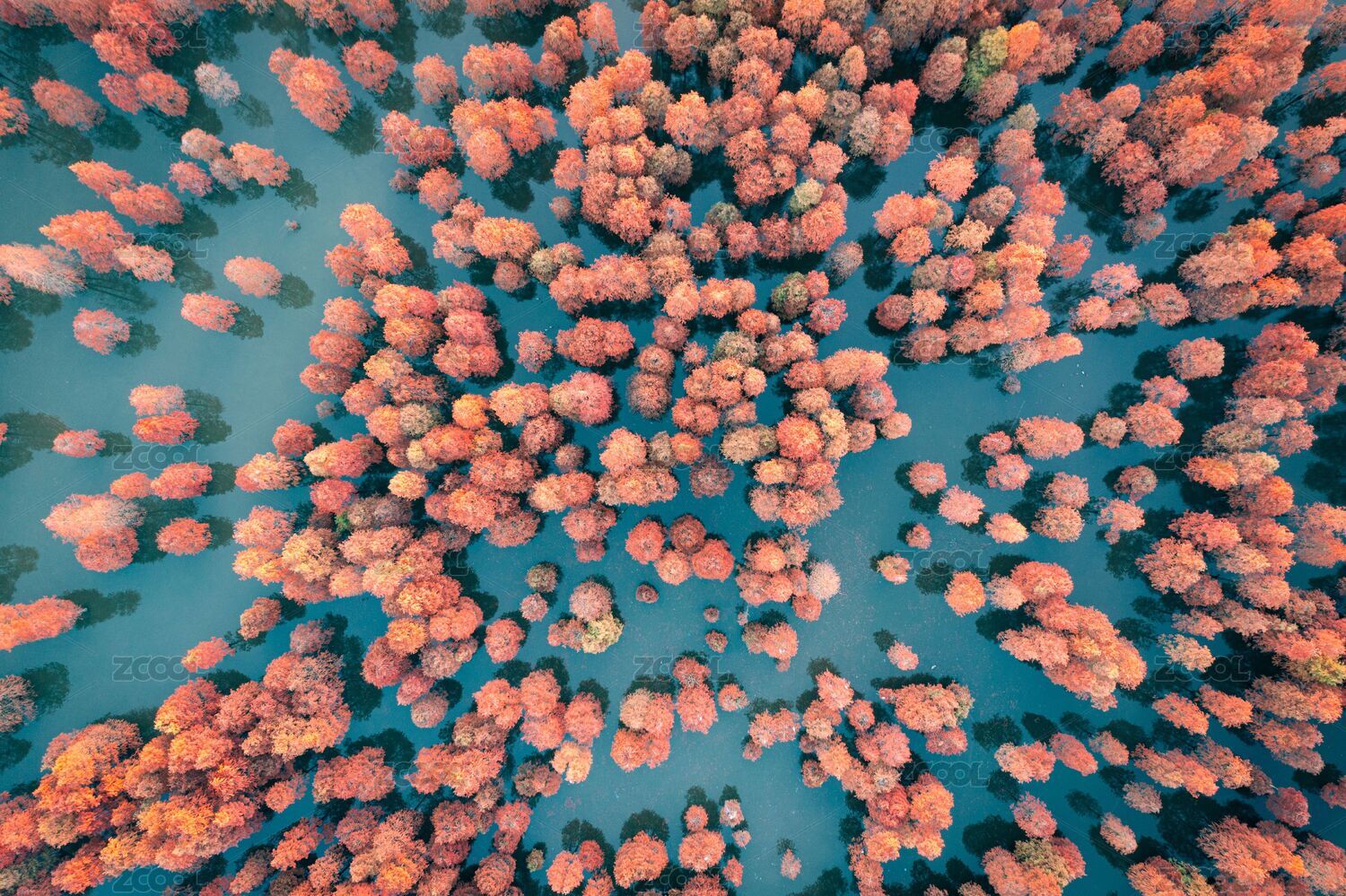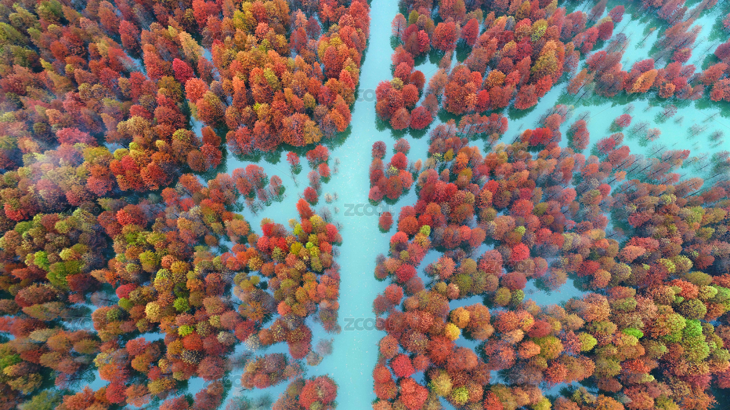航拍中国安徽皖南宣城方塘水上落羽杉秋色