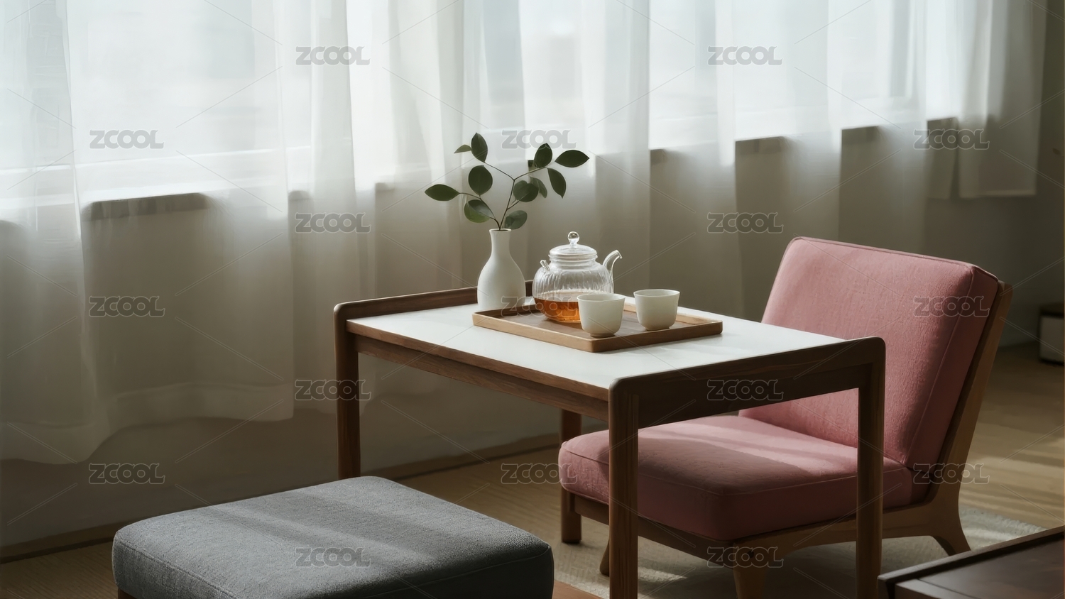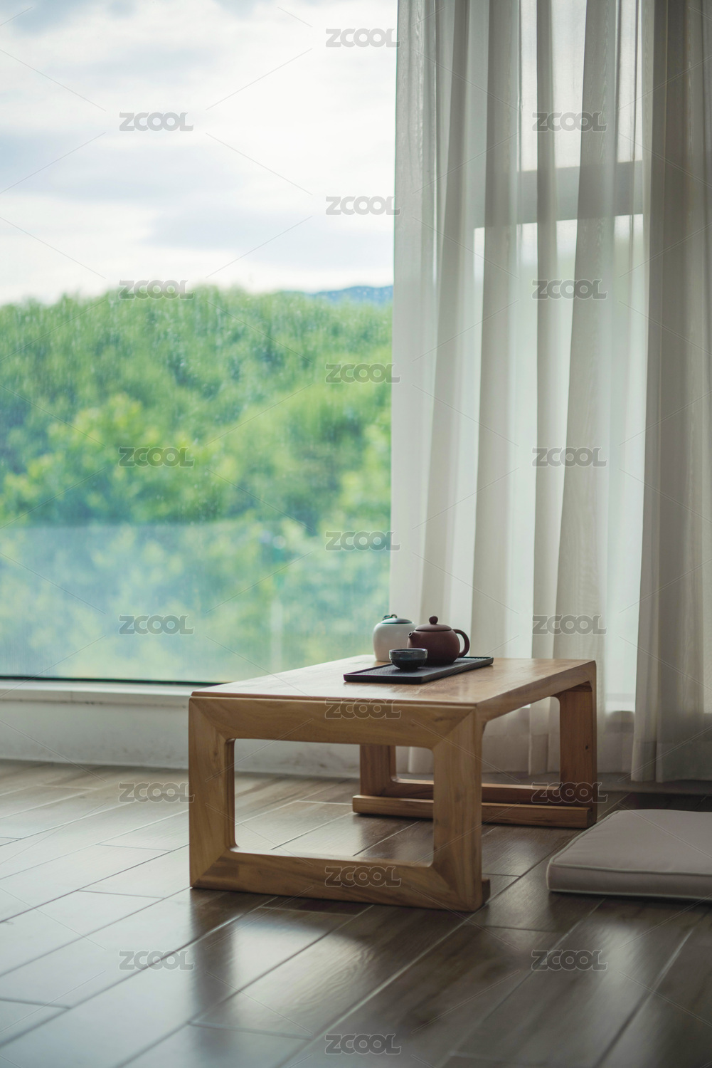 白纱帘落地窗边的茶几茶具