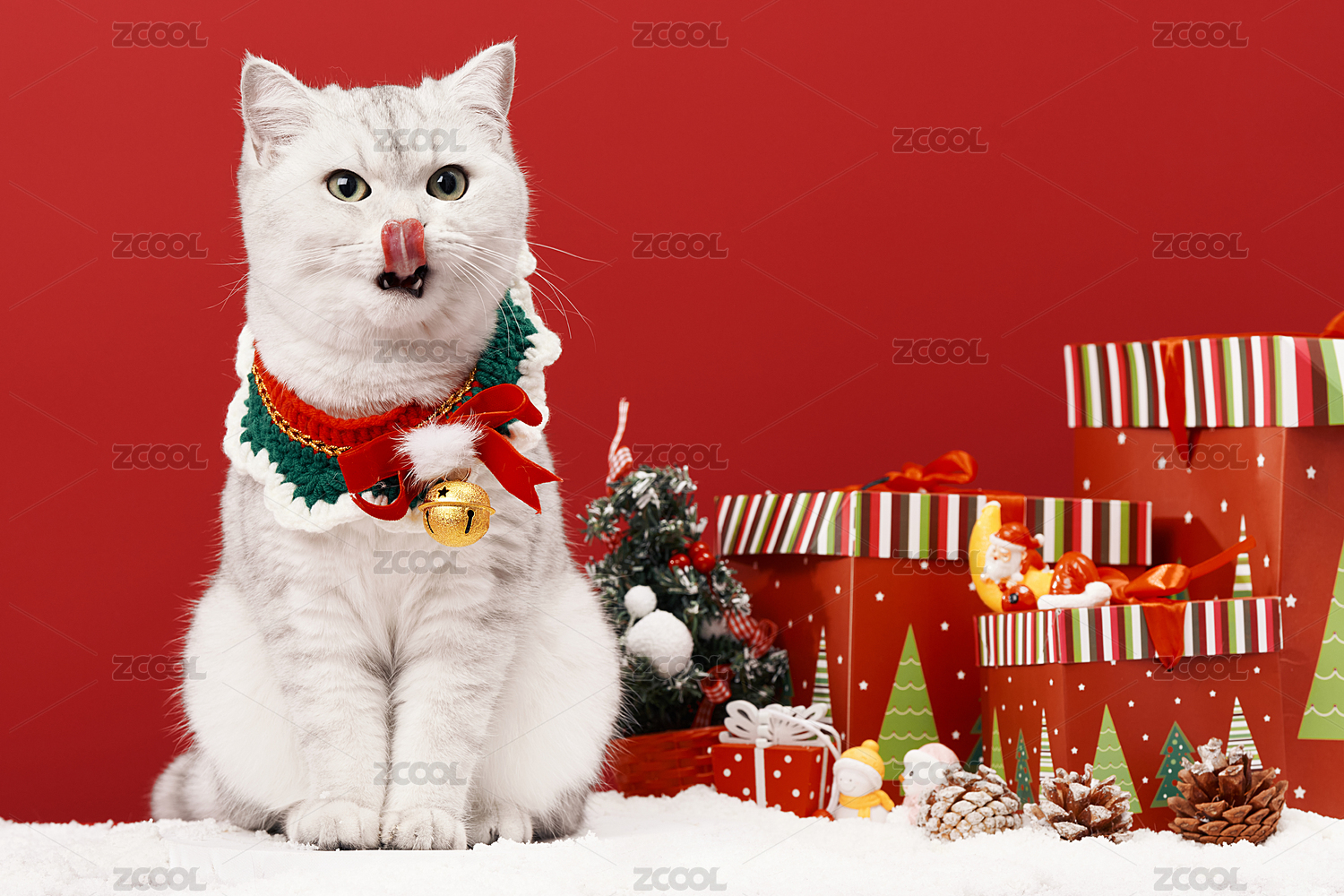 红色背景前可爱银渐层圣诞猫形象