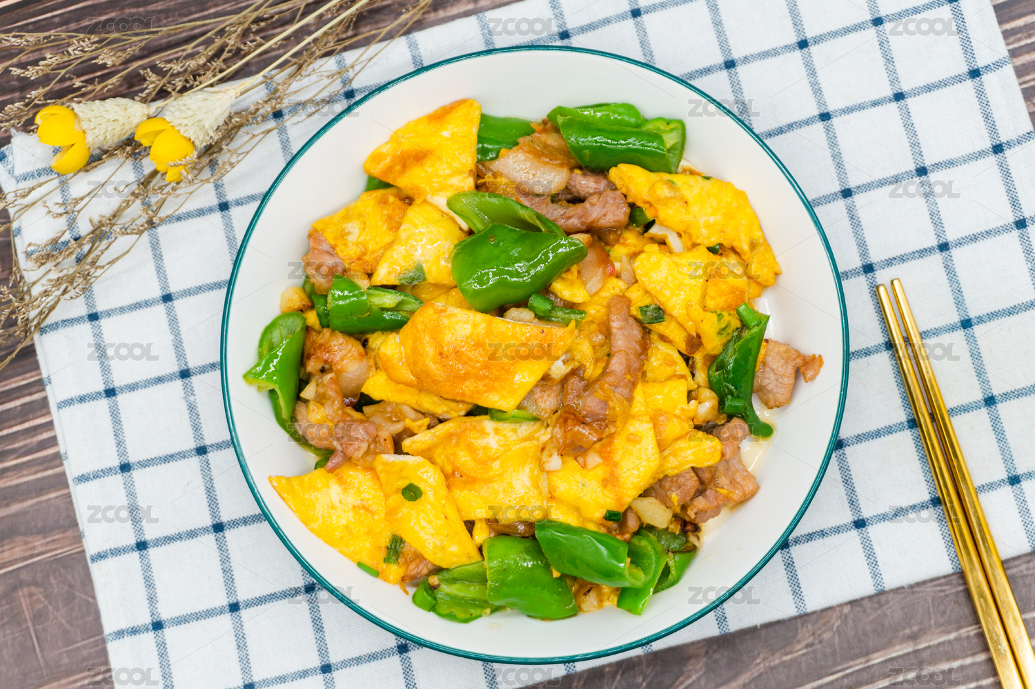 木桌背景一盘辣椒炒鸡蛋