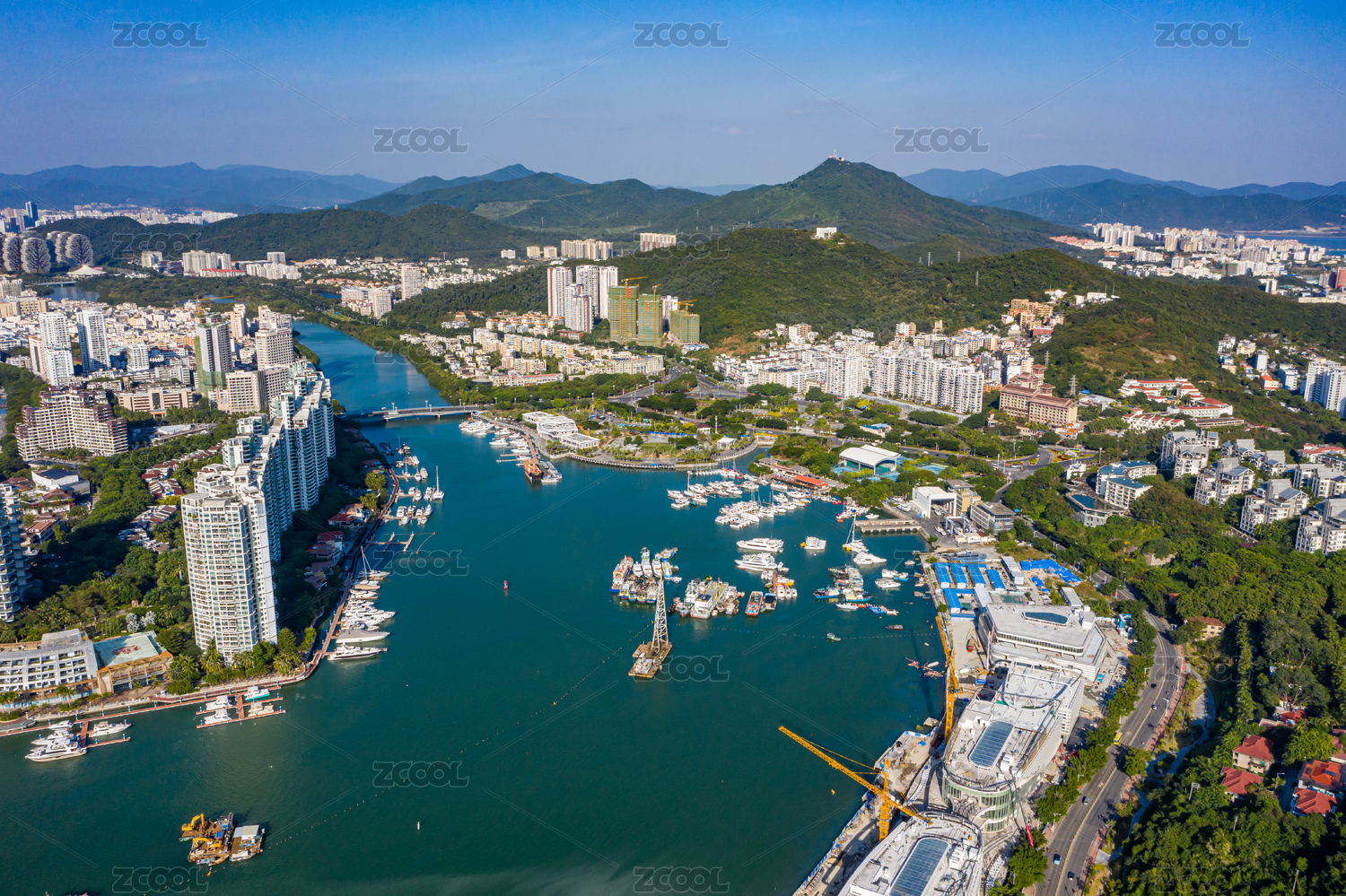 海南三亚三亚湾游艇基地三亚河高视角航拍城