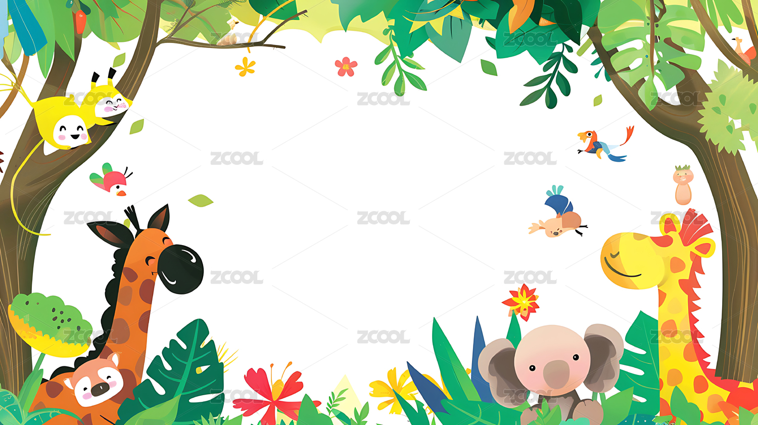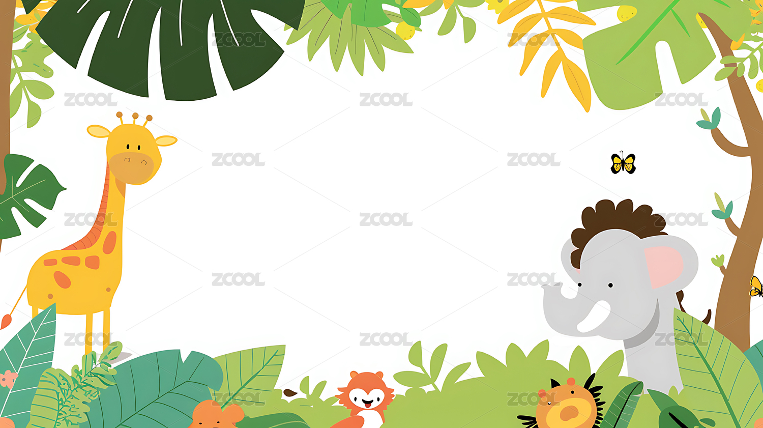 可爱卡通动物绿叶背景边框,儿童卡片明信片