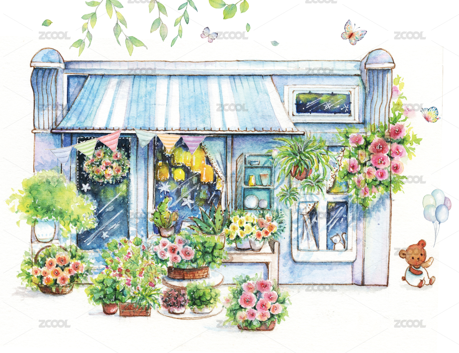 AIGCFG03,小清新,建筑,花店,店铺,水彩,房,屋,花,花盆