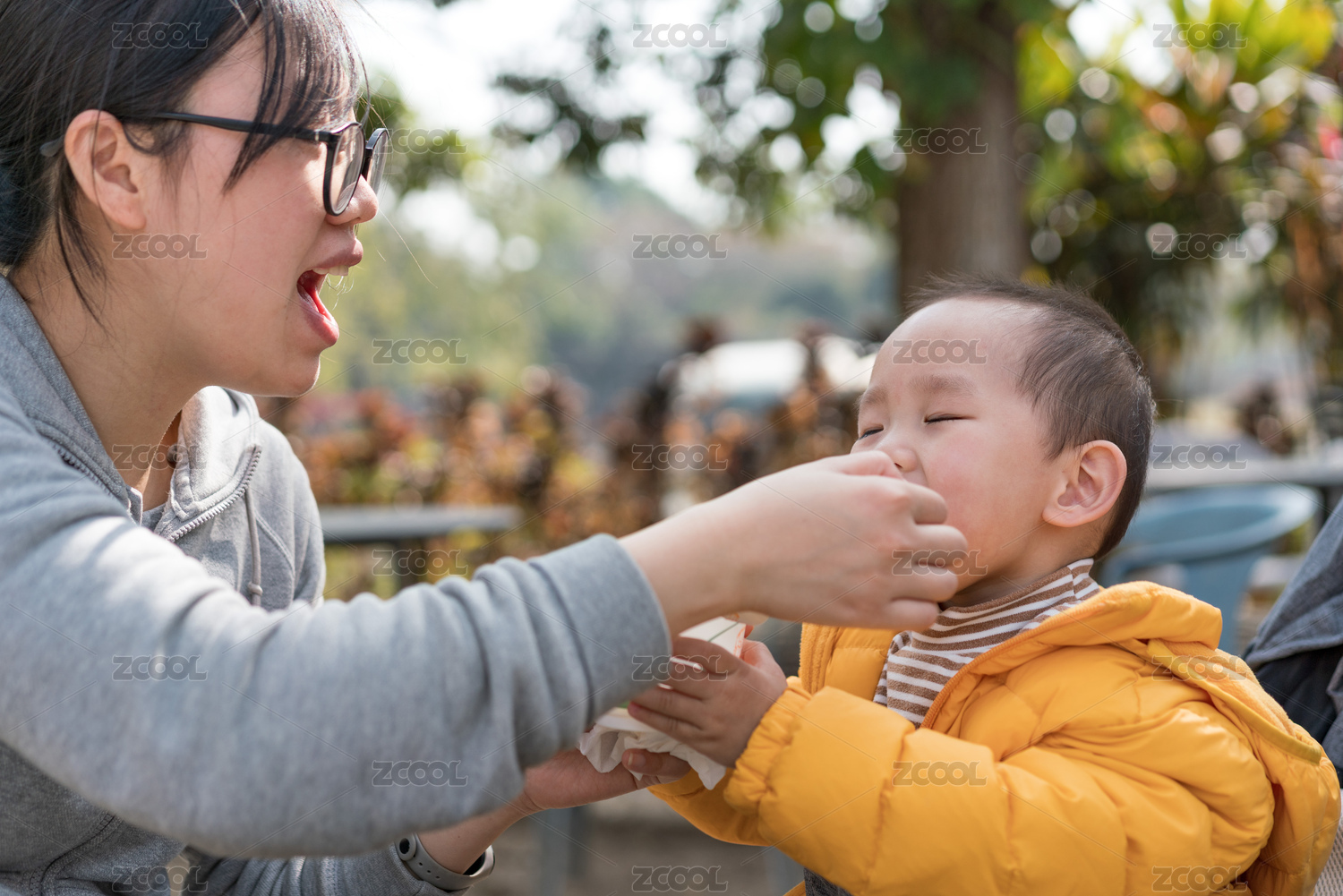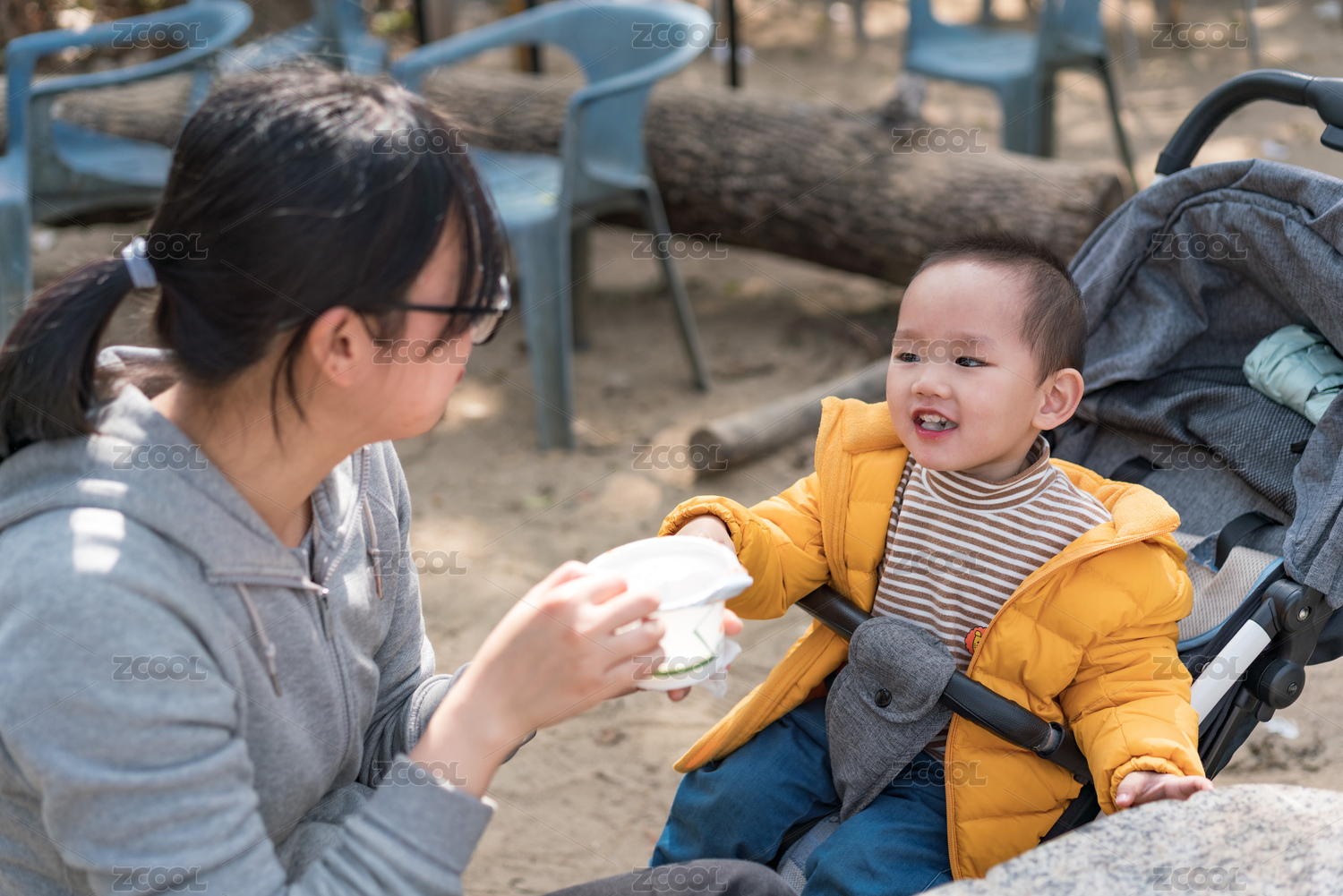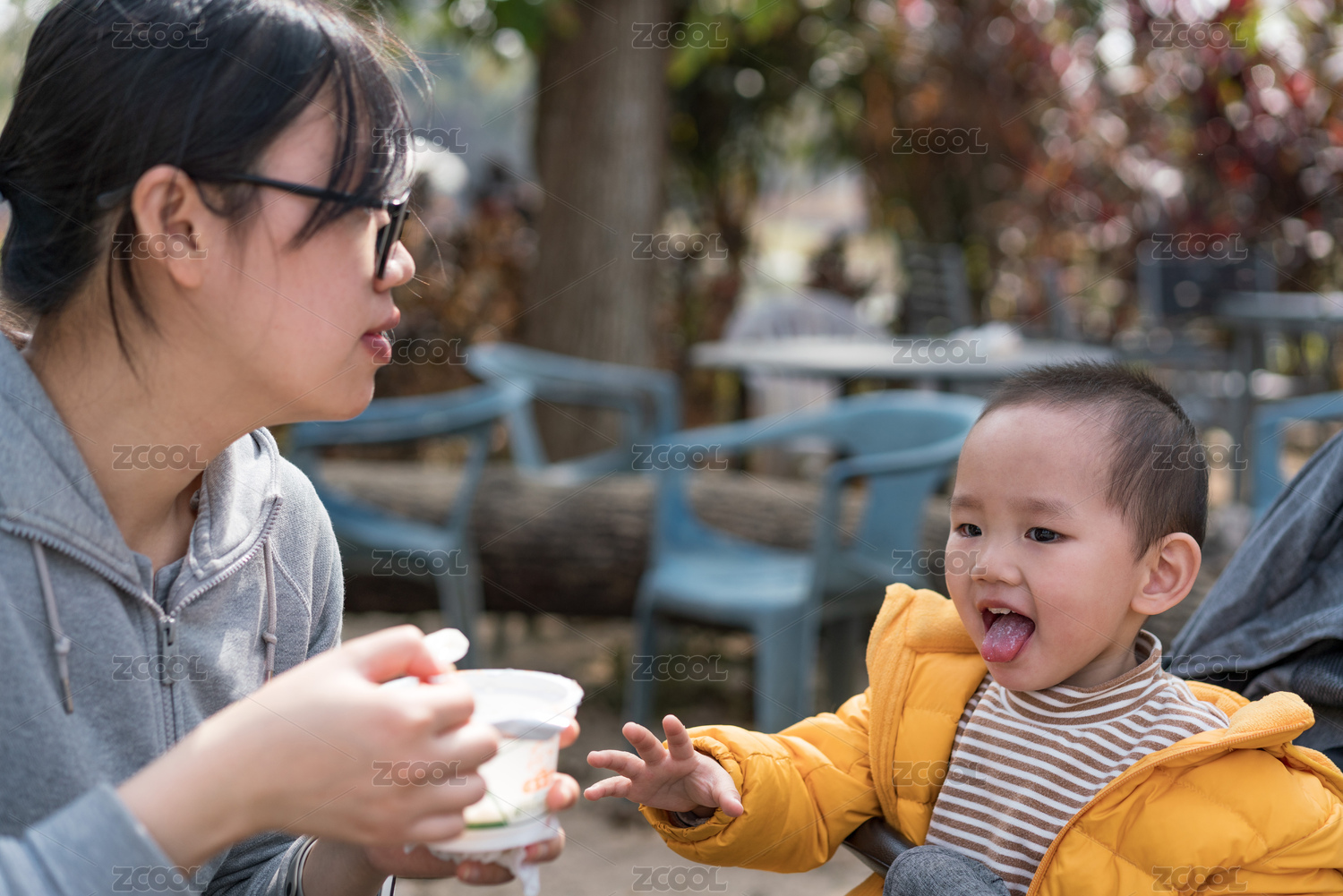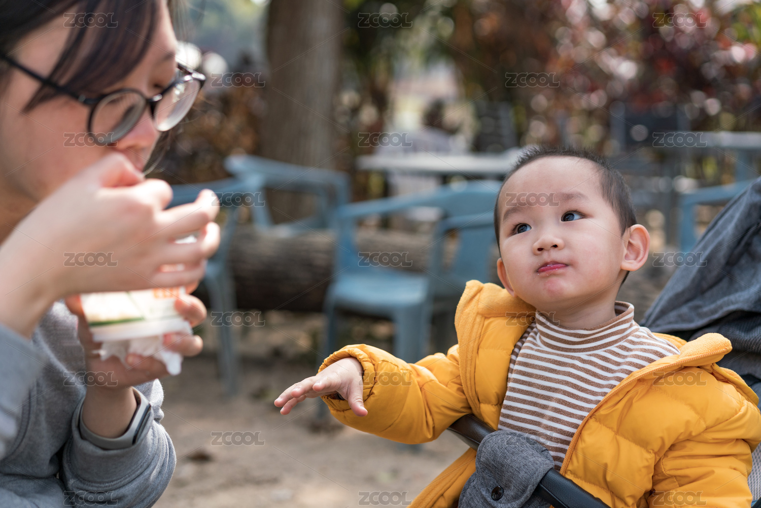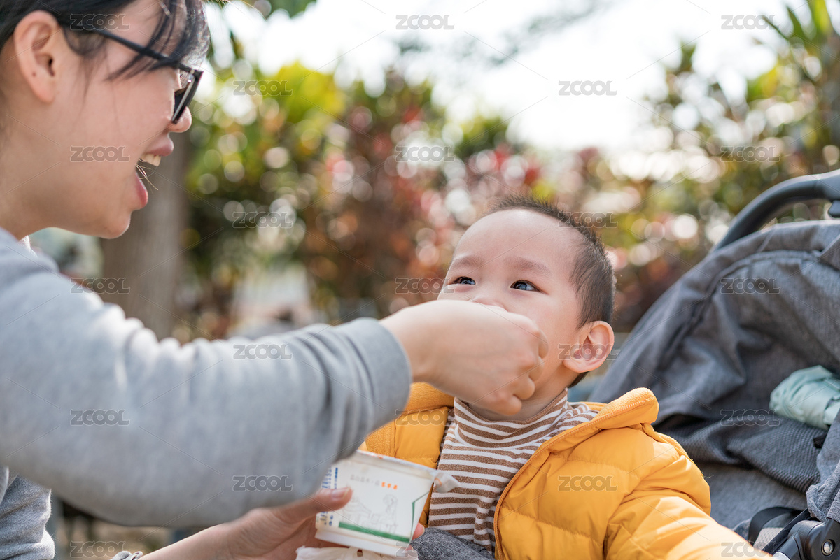 亚裔母亲带着儿子游览公园、分享美食