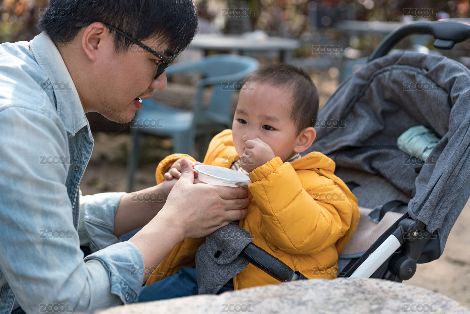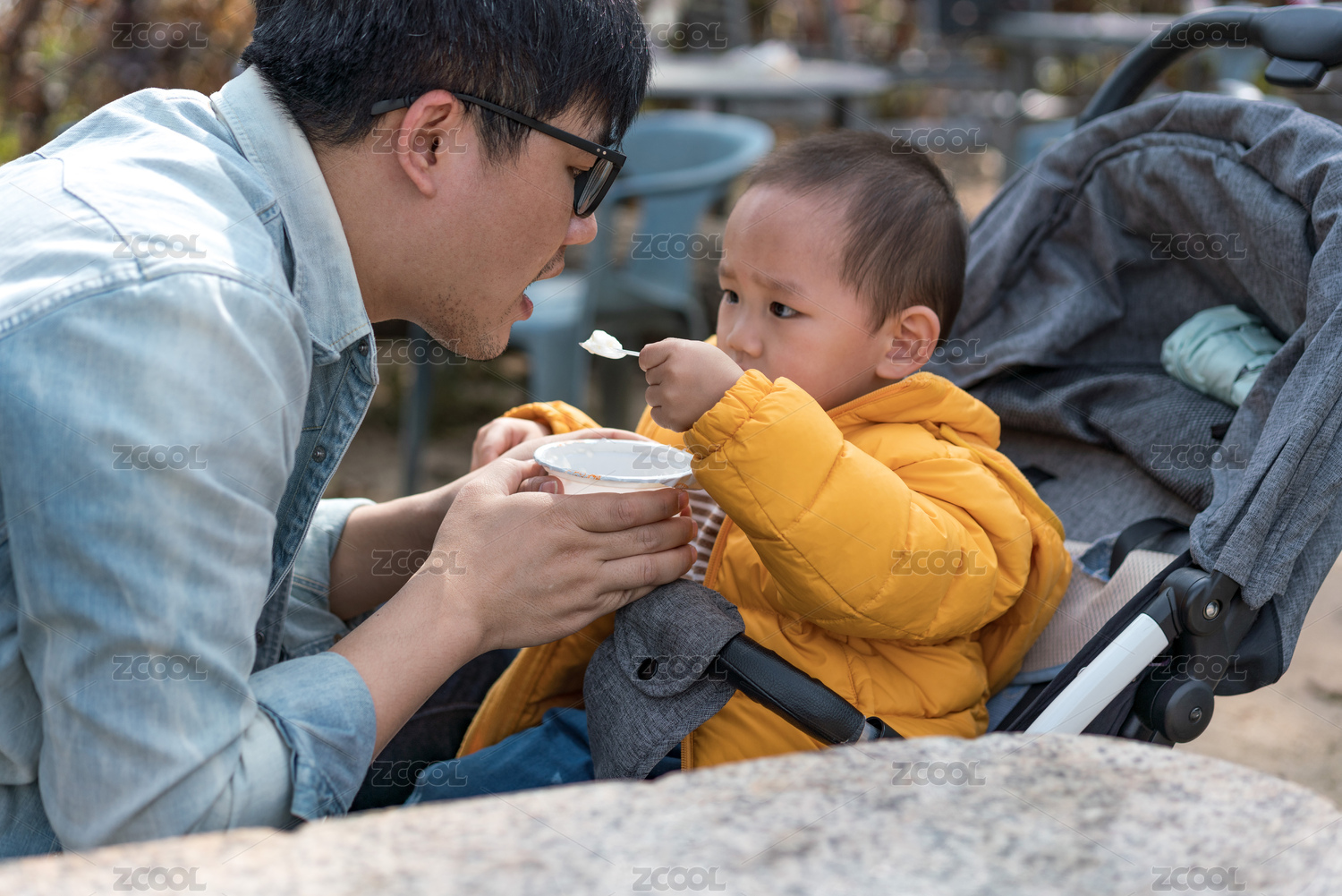 亚裔父亲带着儿子游览公园、分享美食