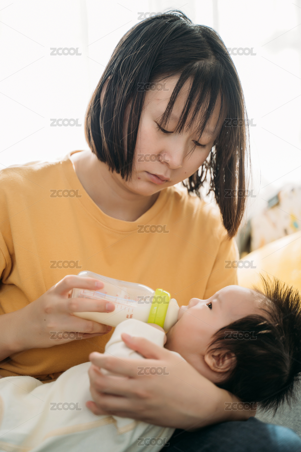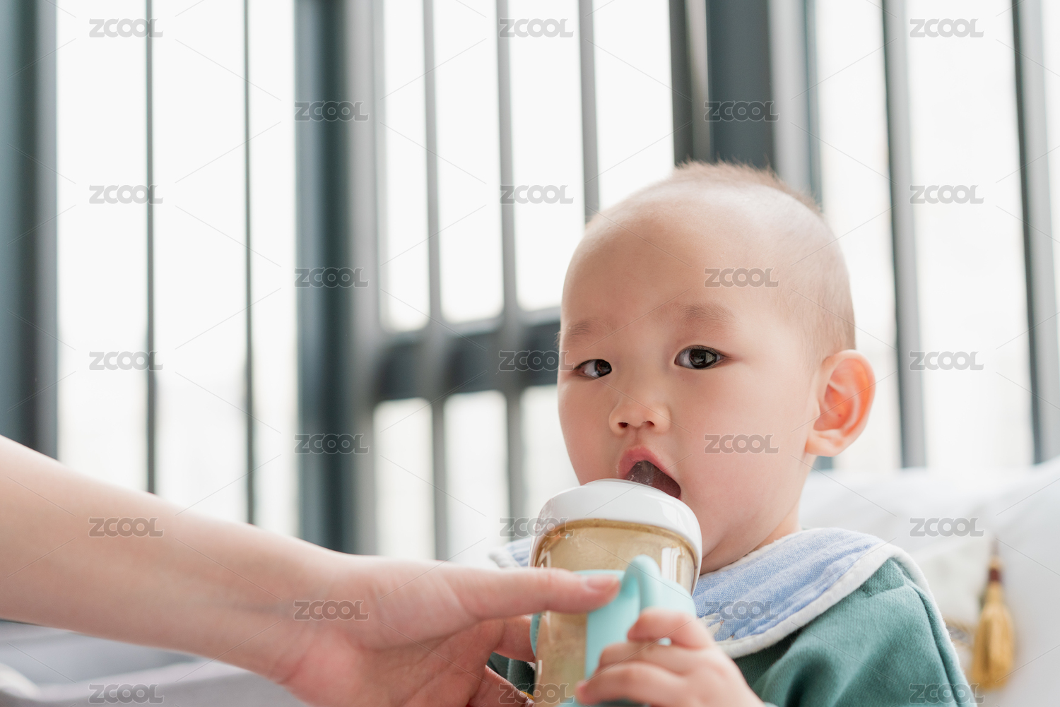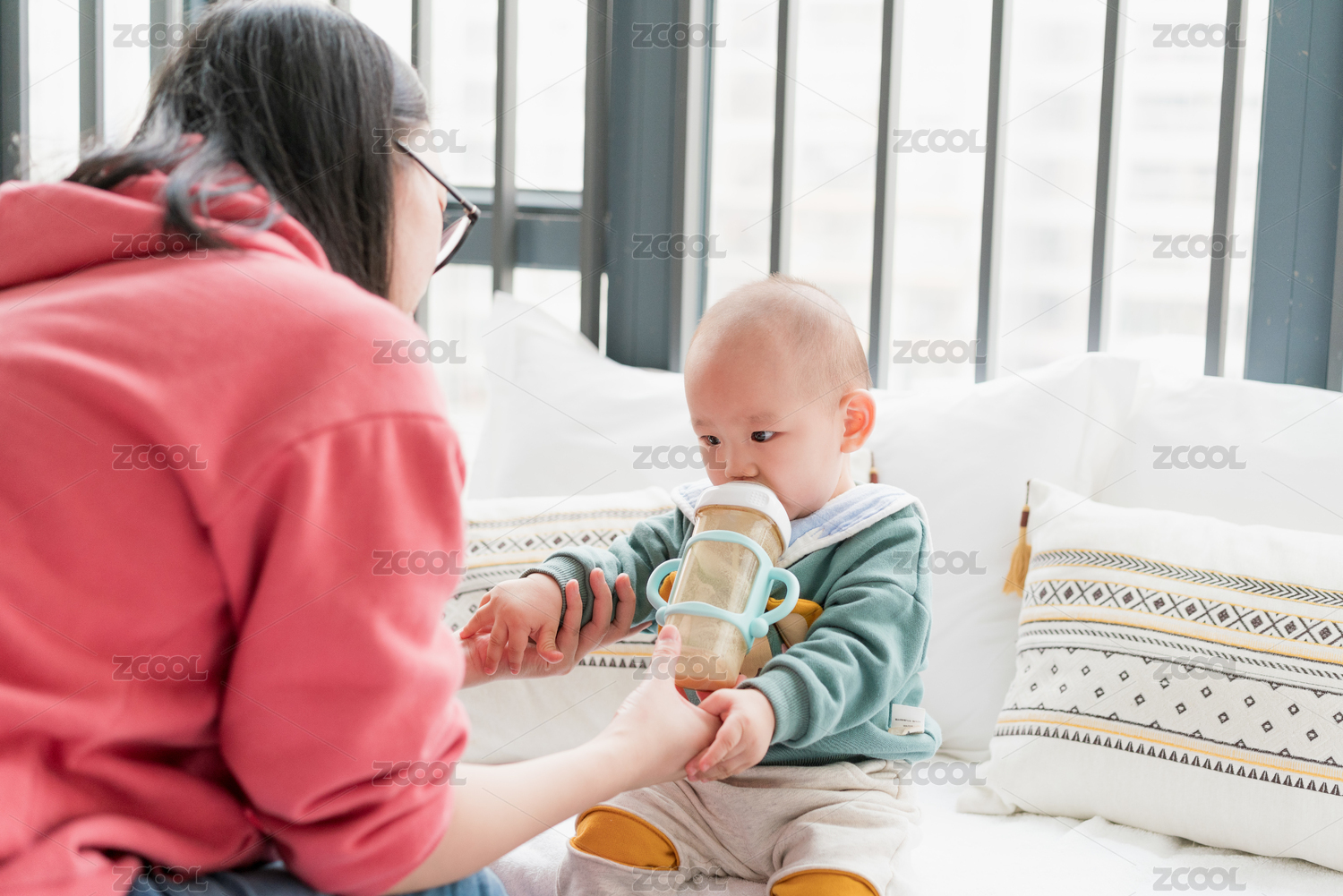 亚裔婴儿坐在飘窗上吃奶