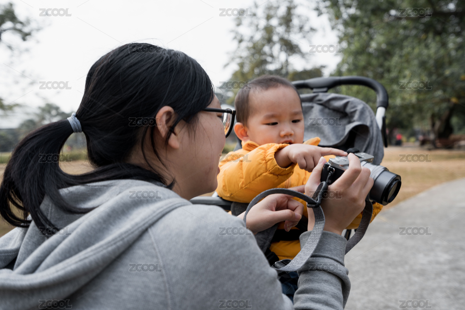 亚裔母亲带着儿子游览公园、拍照