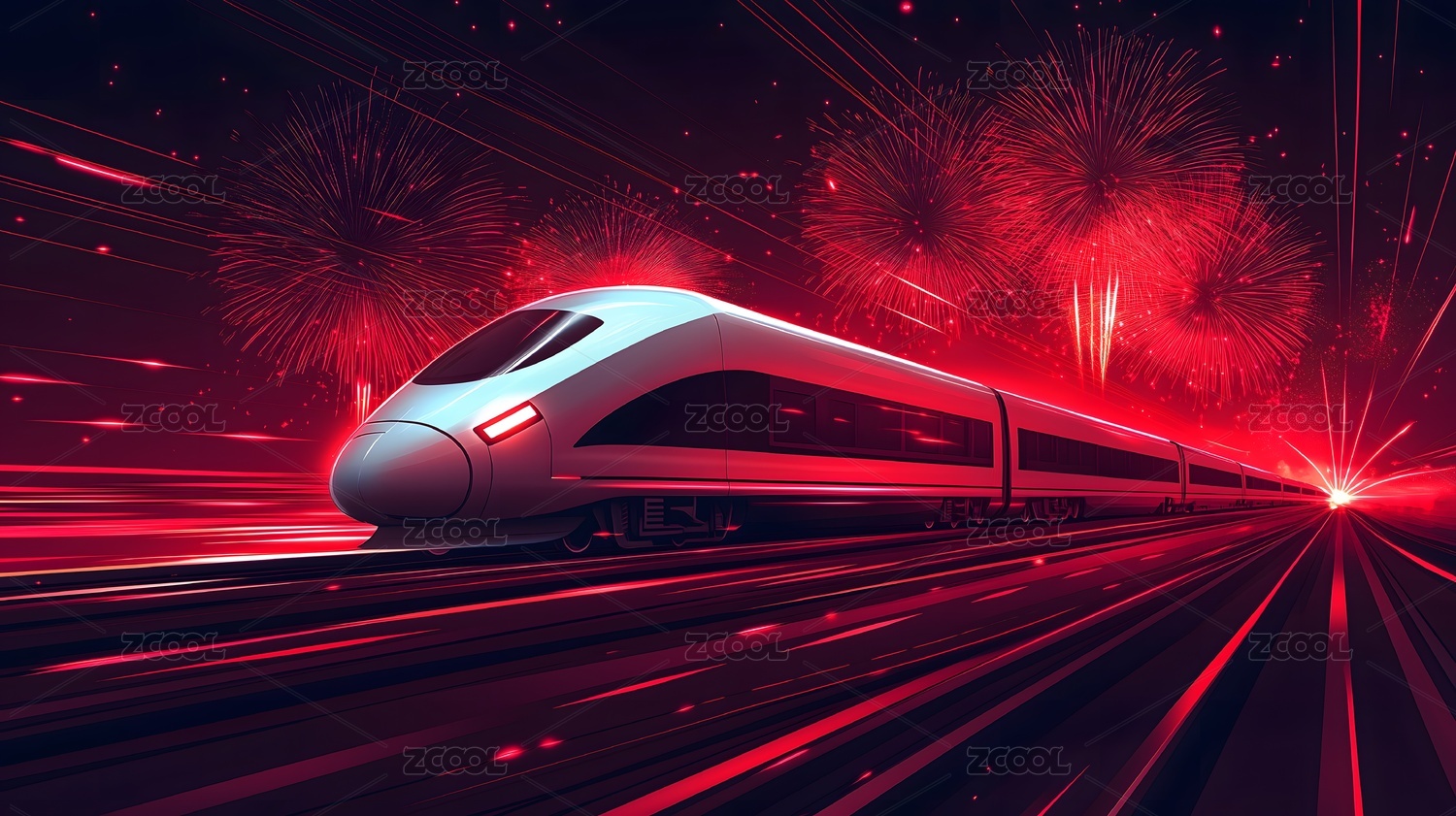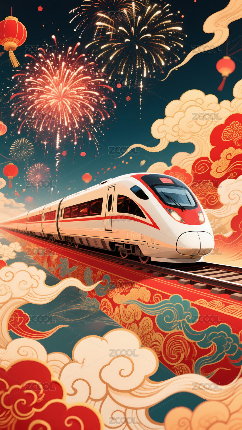 红色喜庆烟花绽放的背景下高铁动车春运素材