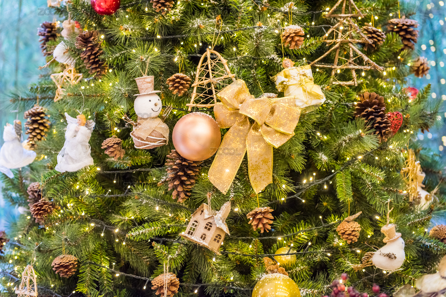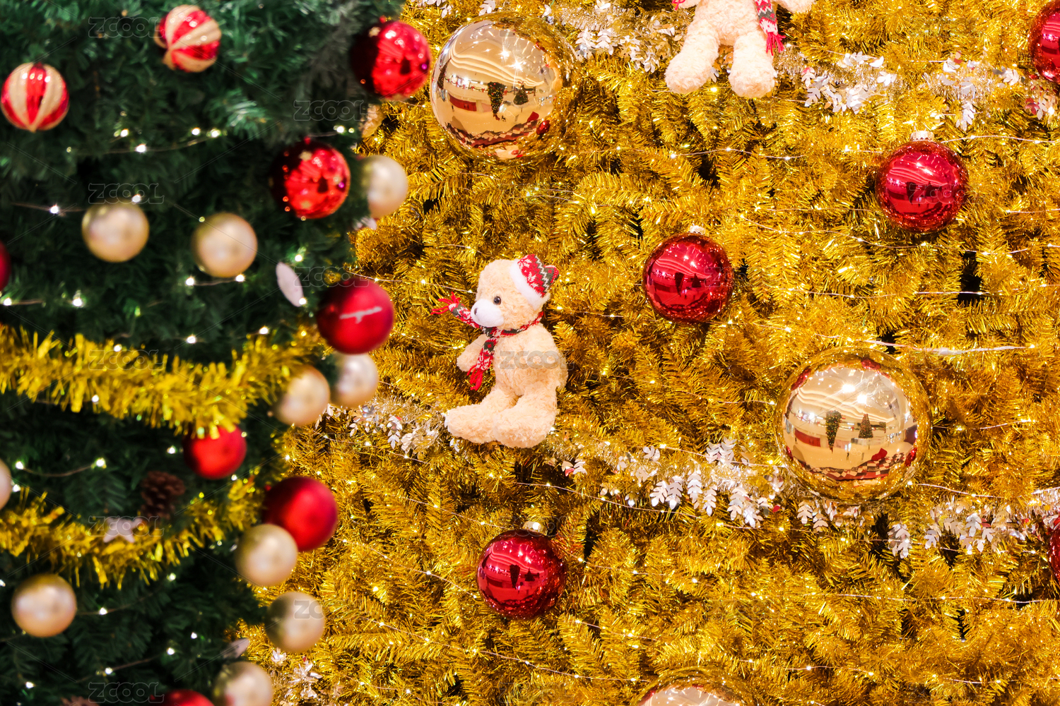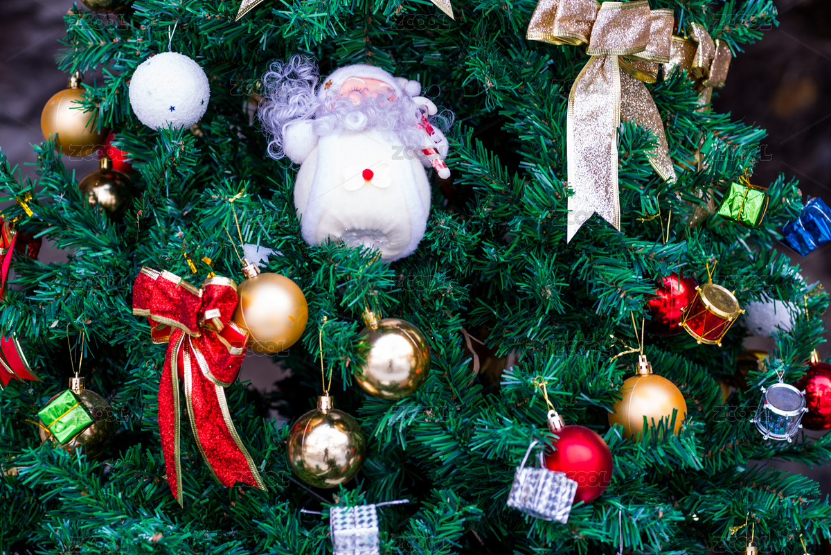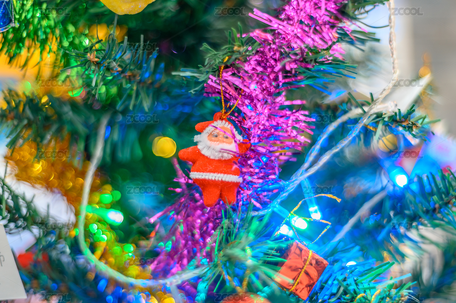 圣诞节里的挂满圣诞礼物的松树局部特写节日素