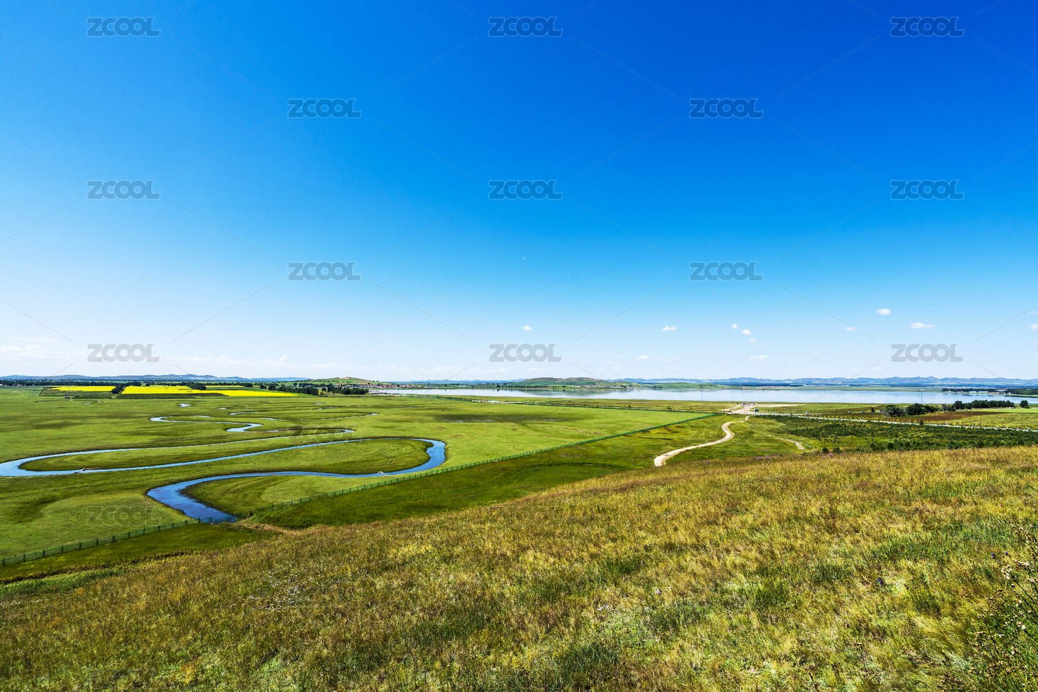 蓝天下河北沽源绿色草原上滦河九曲十八弯