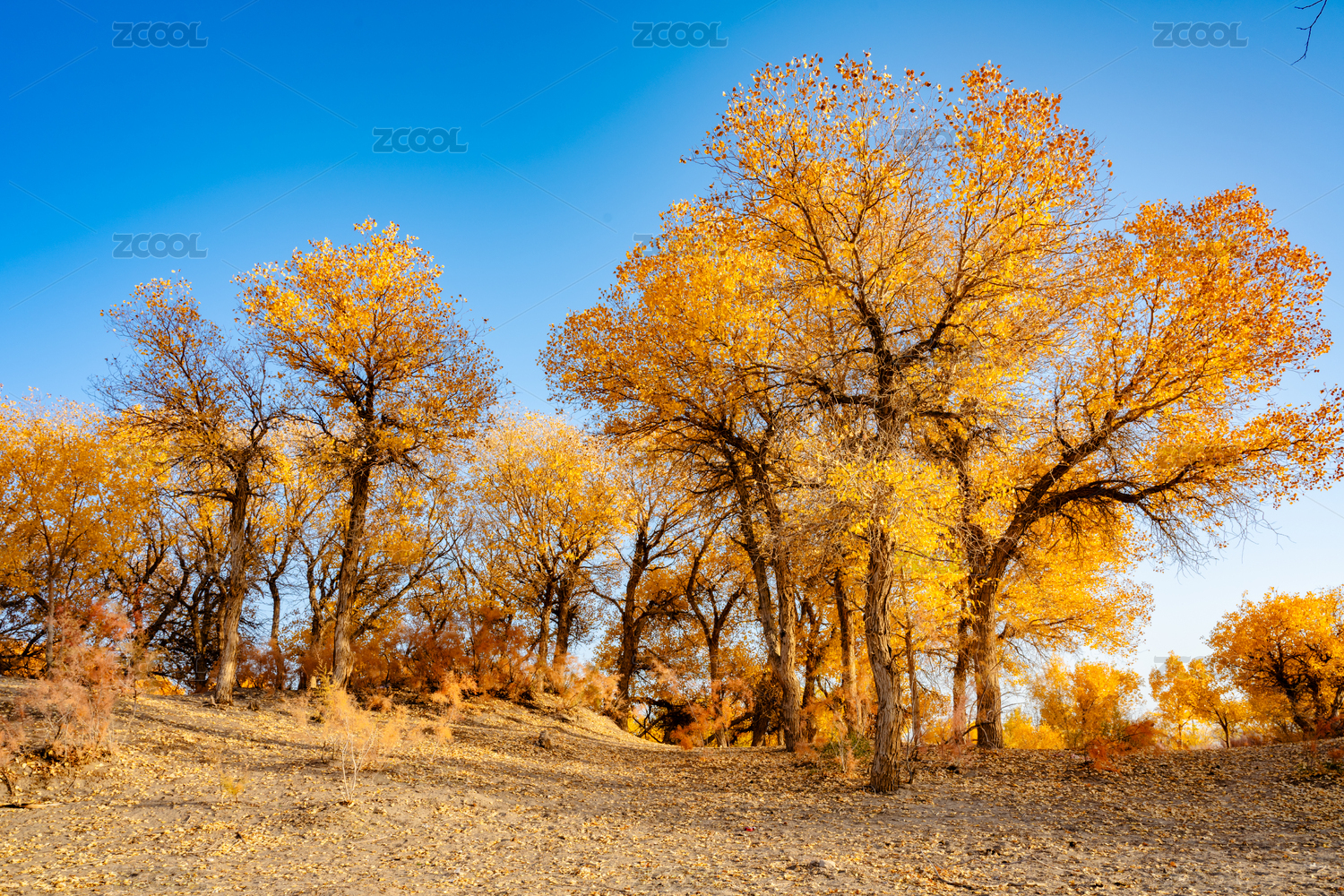 秋季蓝天下内蒙额济纳齐胡杨林风光