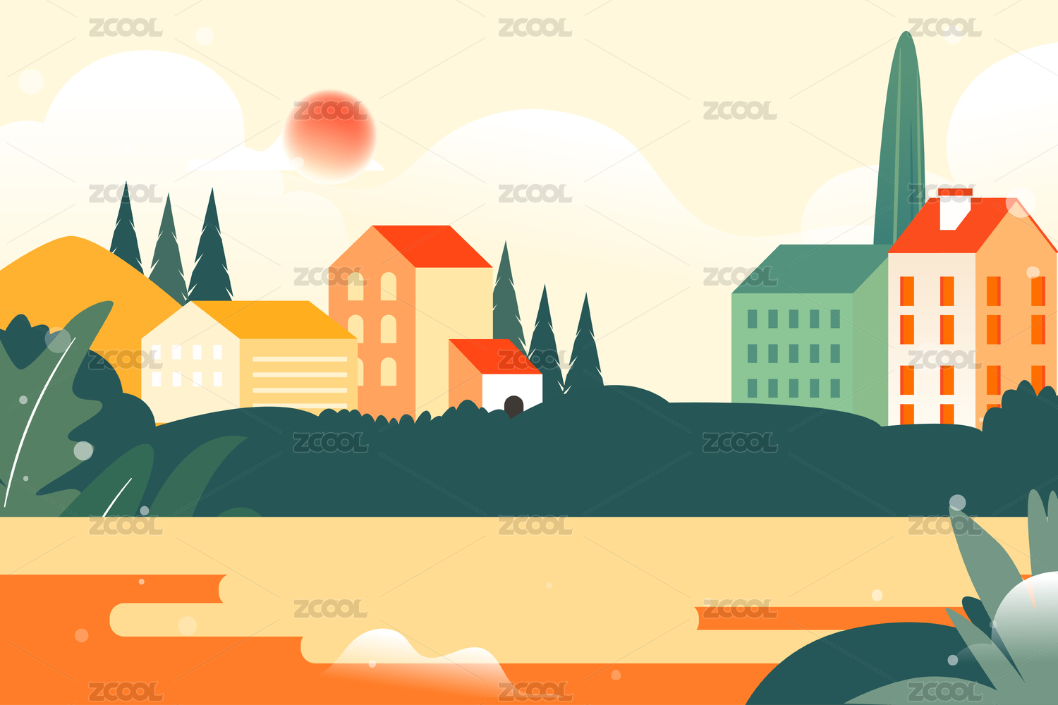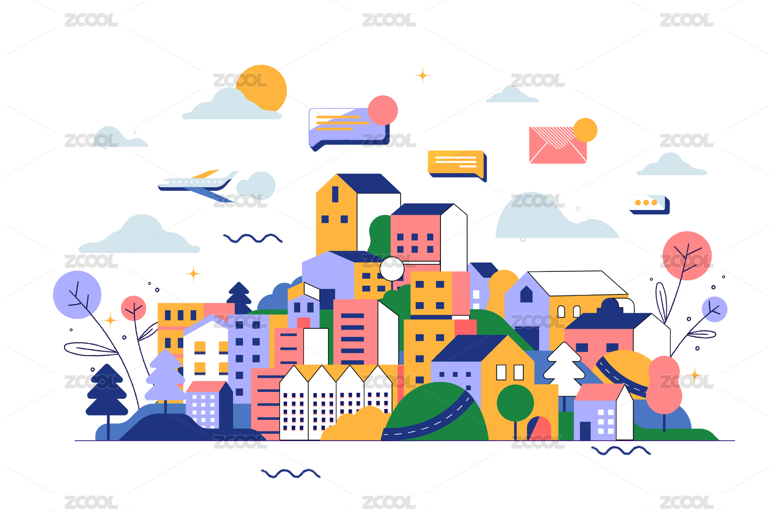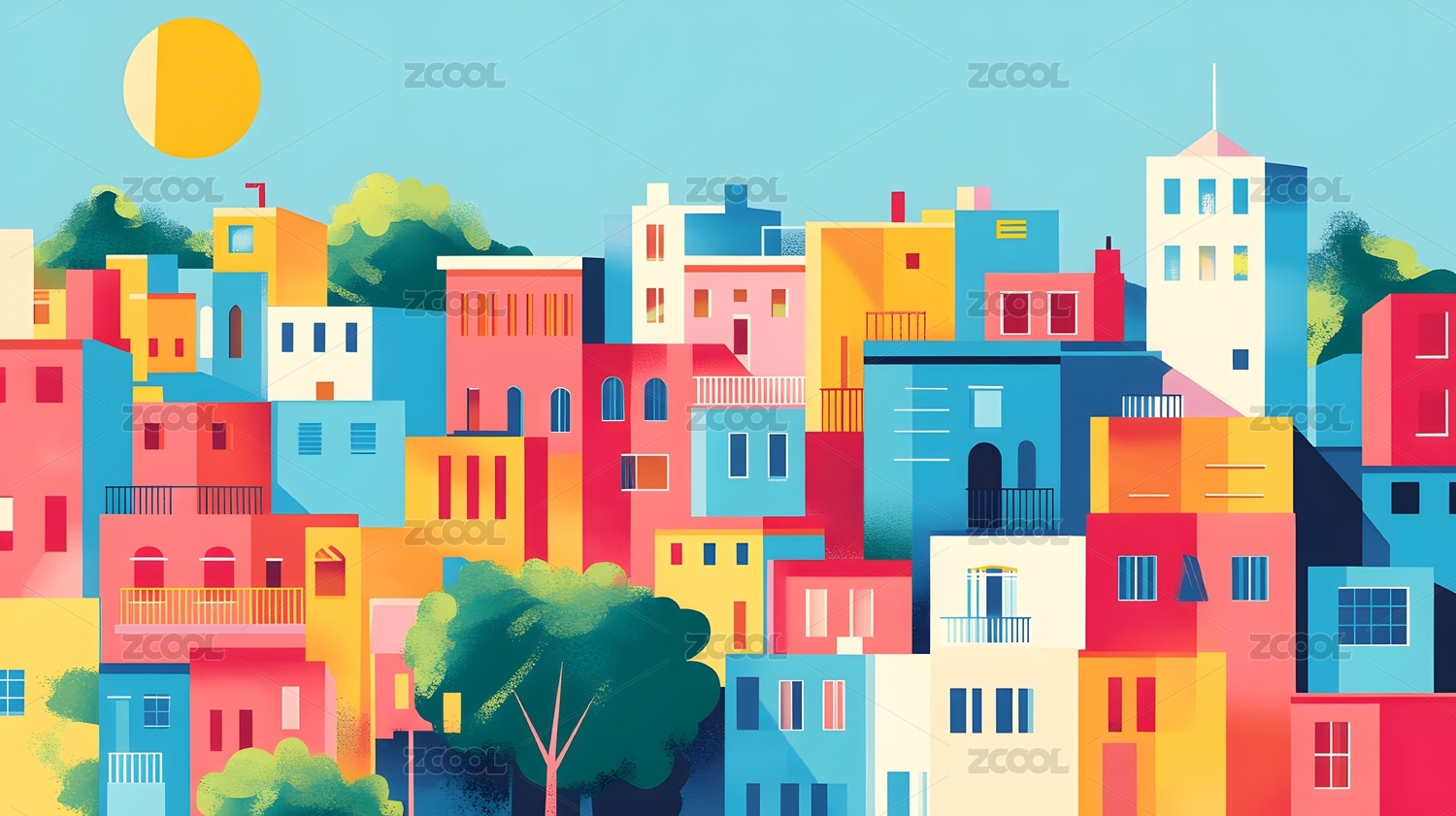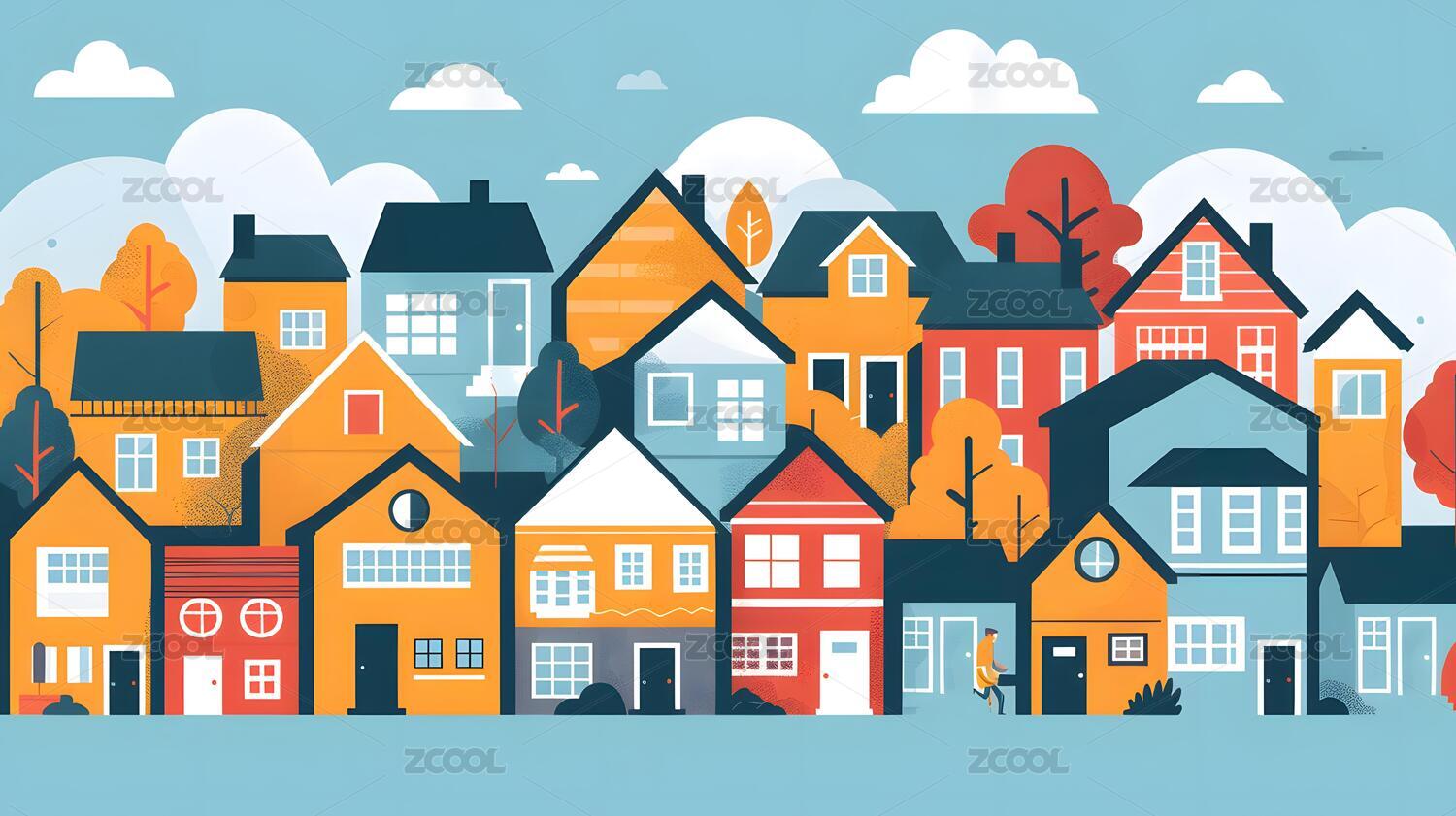 色彩鲜艳的房屋树木城市插画