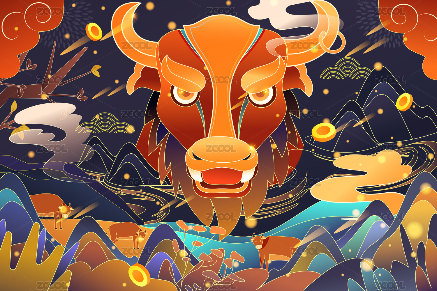手绘国潮风牛转钱坤吉祥背景