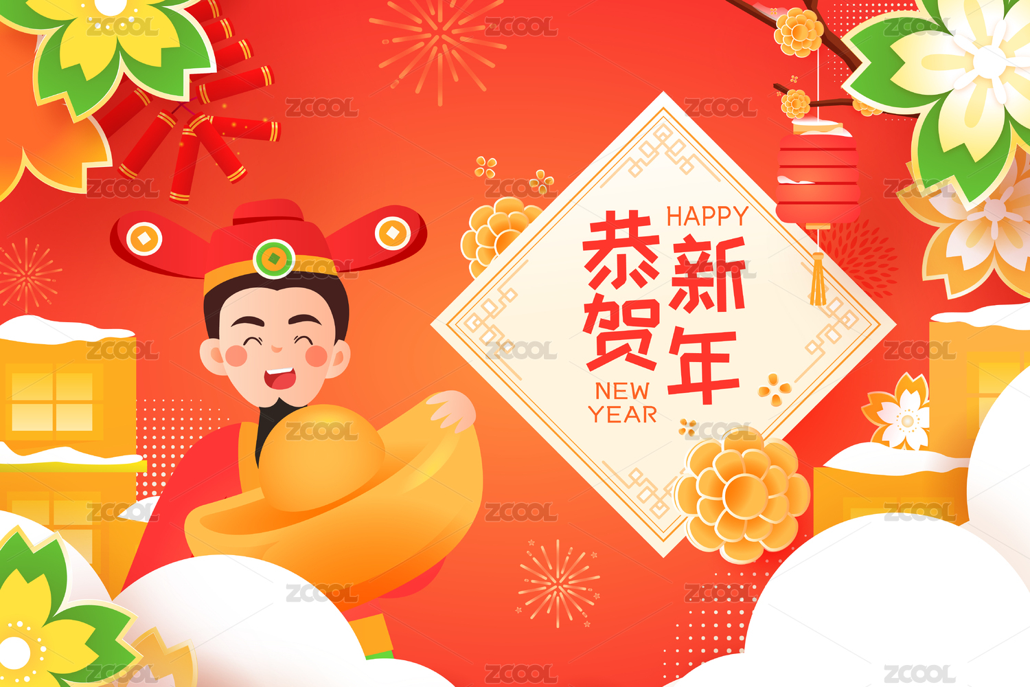 卡通2020鼠年迎财神贺新年背景矢量插画