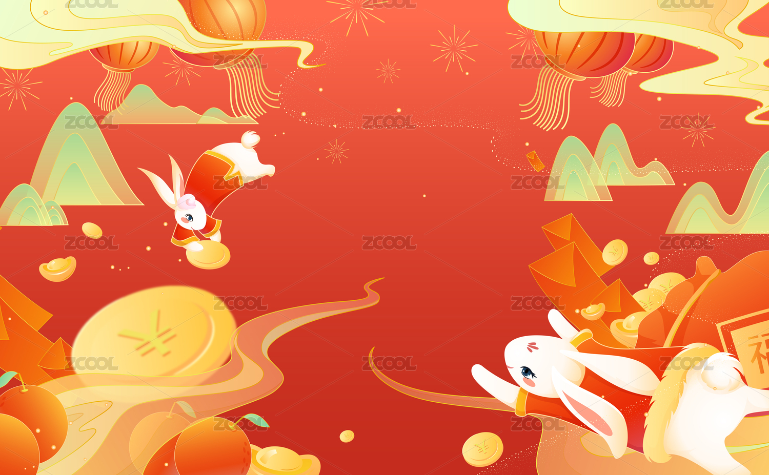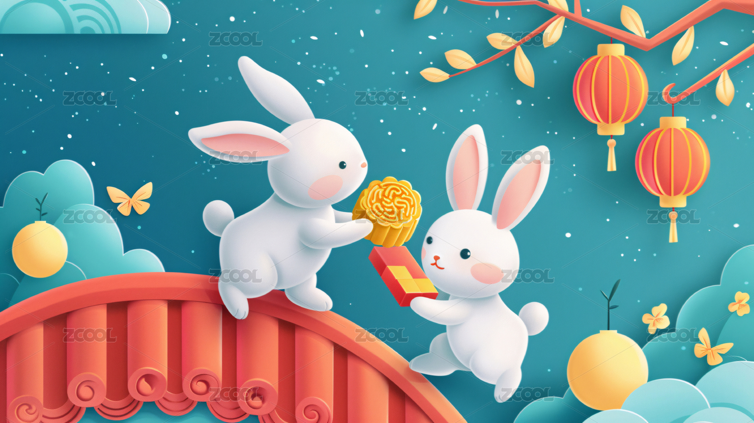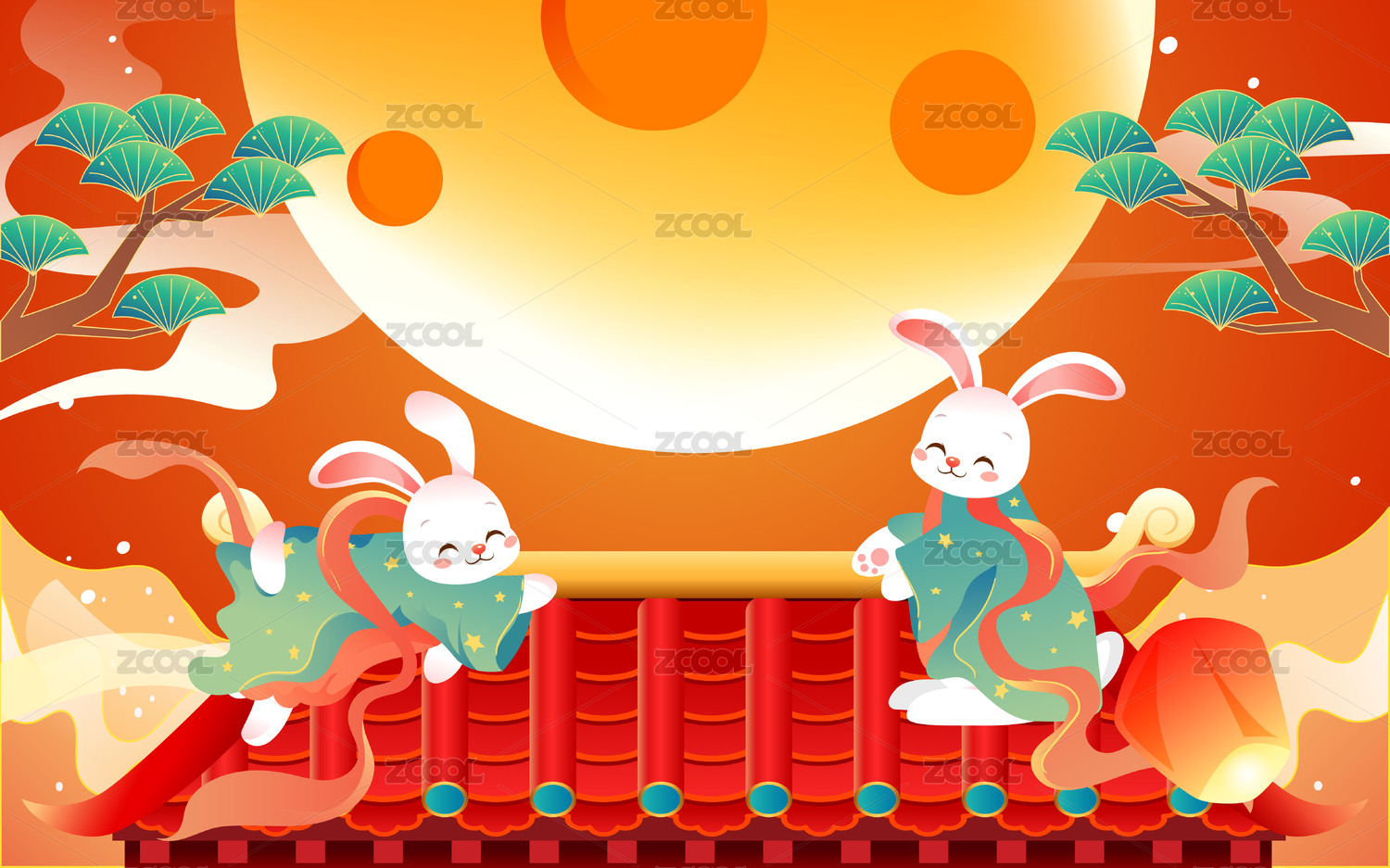 中秋节红色氛围屋顶上的兔子和圆月插画背景