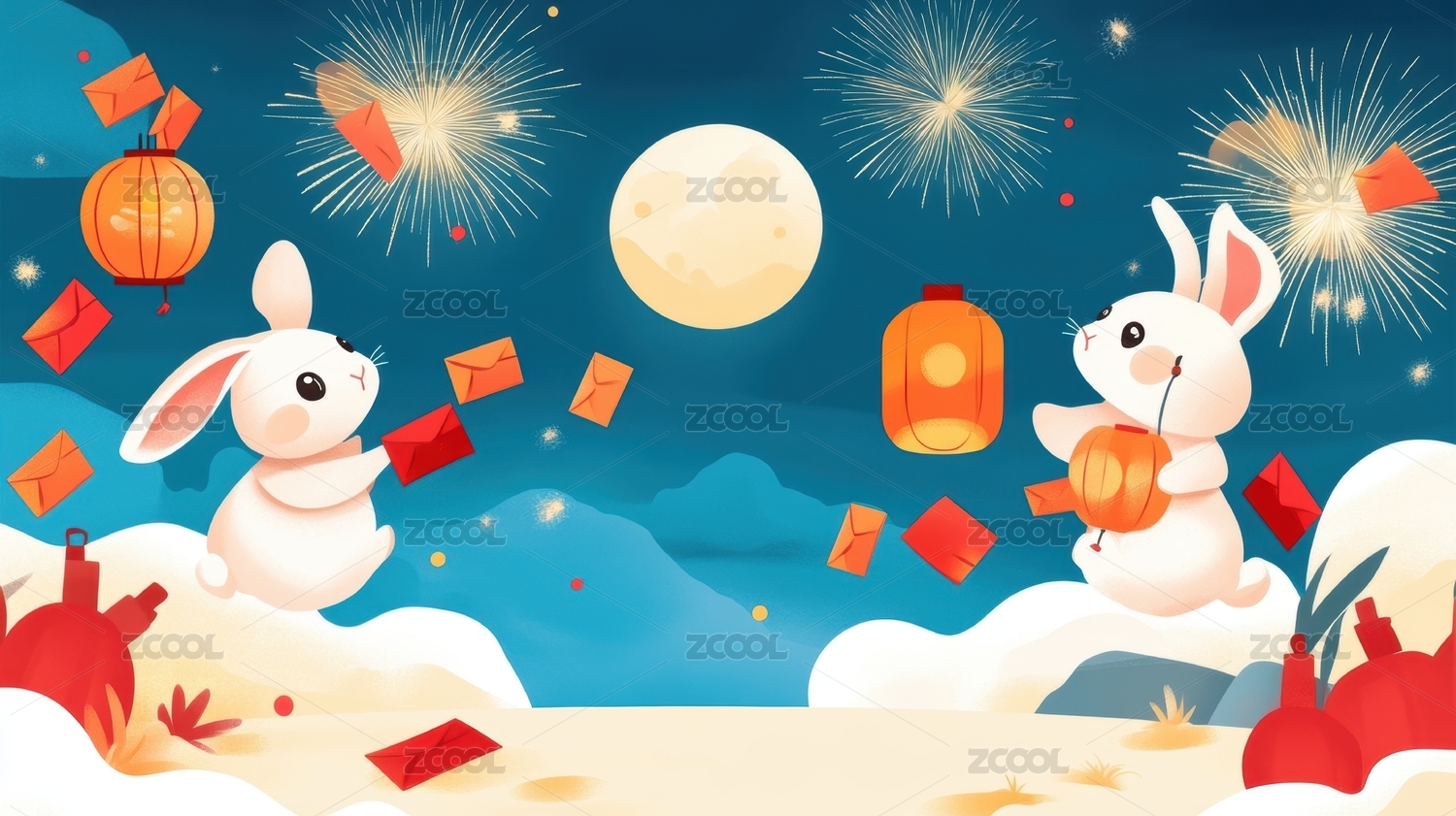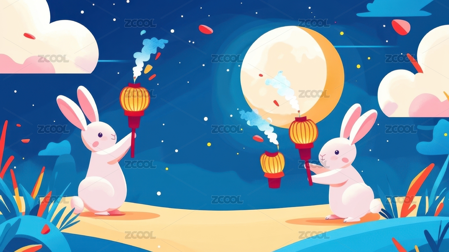 八月十五中秋节兔子屋顶赏月中国风国潮插画