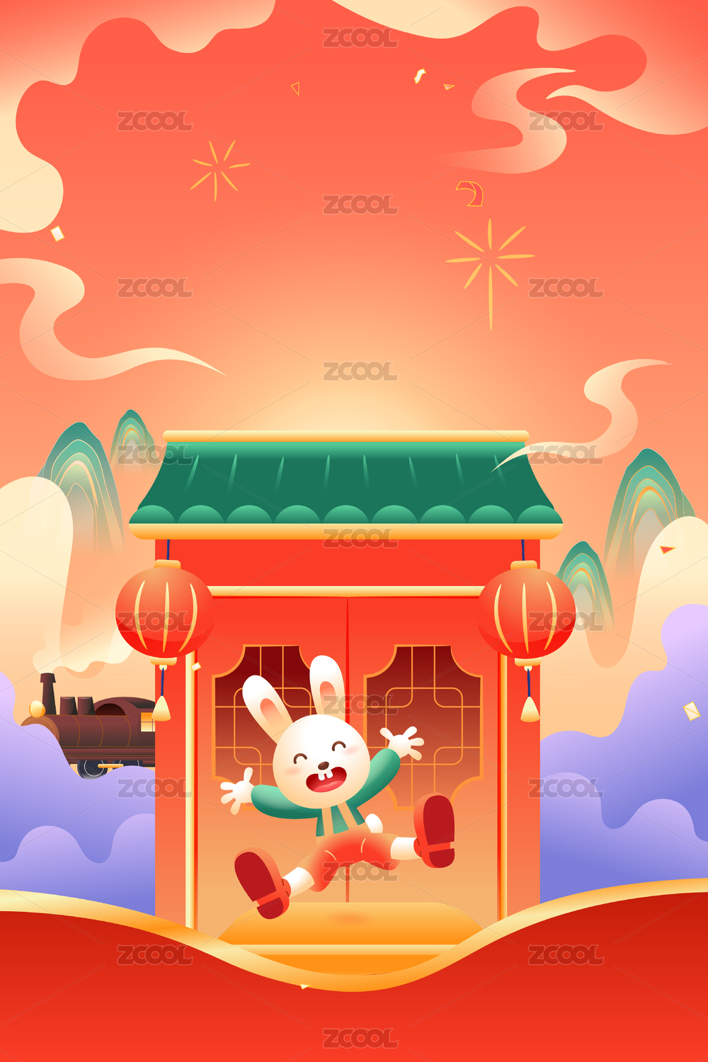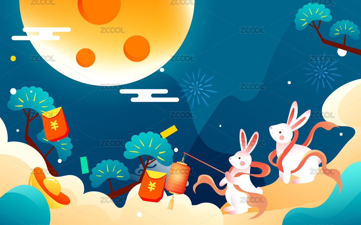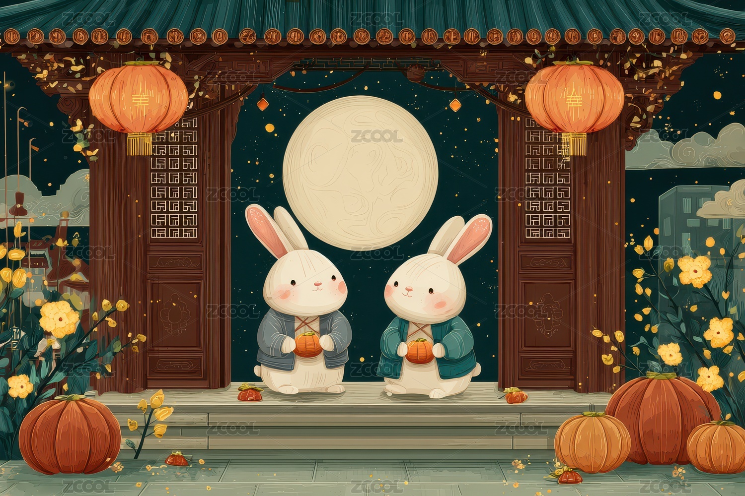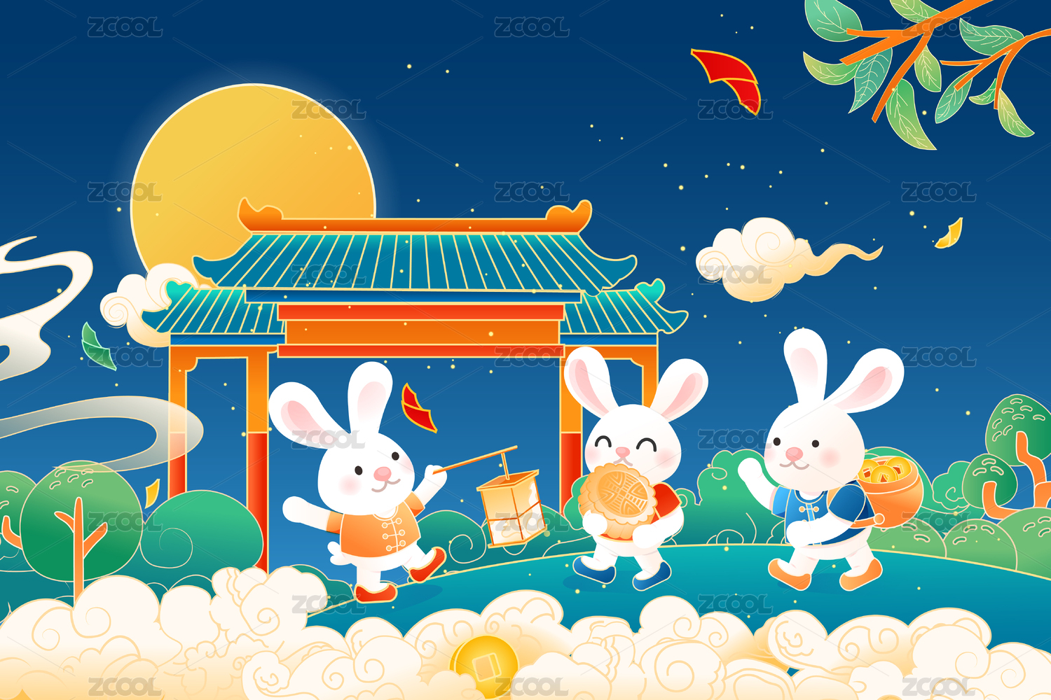 中秋节可爱国潮风玉兔传统节日赏月习俗插画