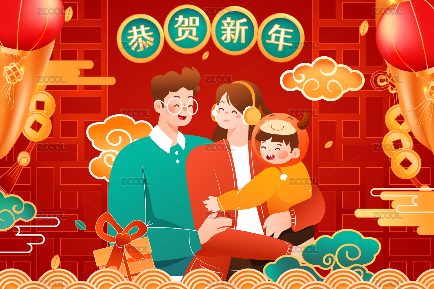 新年亲子矢量插画
