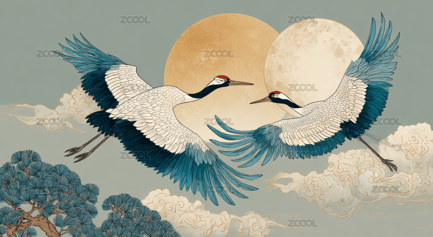 丹顶鹤仙鹤天空祥云中秋中国风矢量插画
