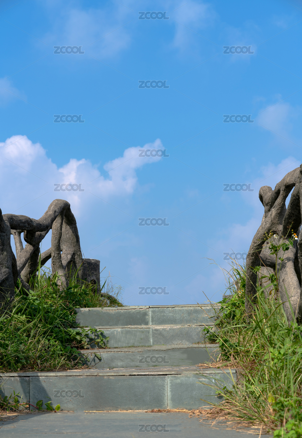 中国深圳梧桐山,蓝天白云下的登山石阶长廊