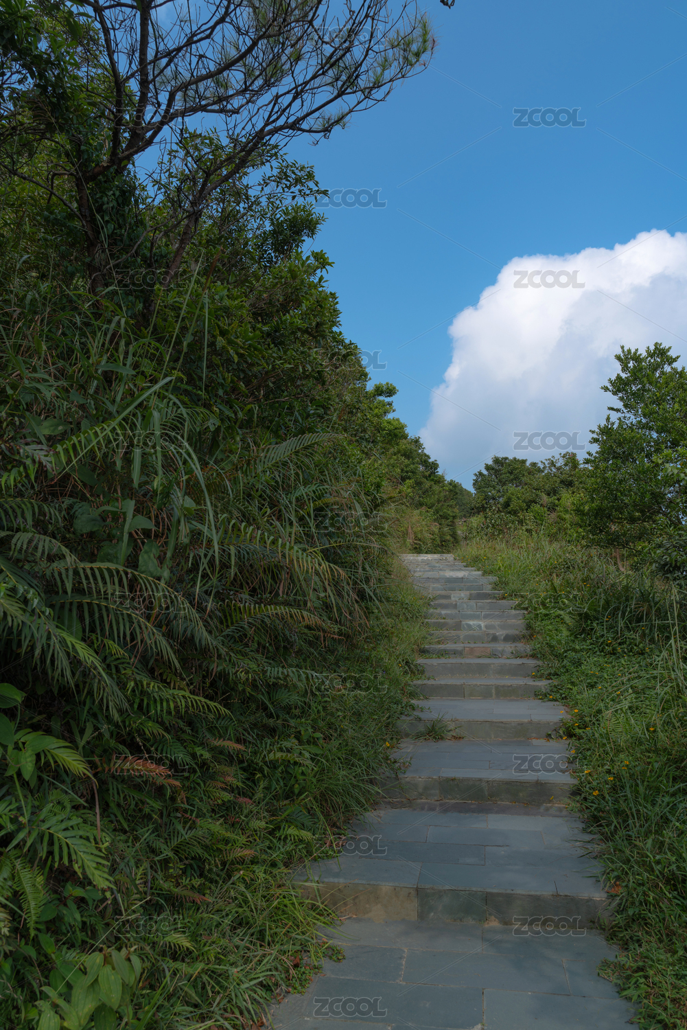 中国深圳梧桐山,蓝天白云下的上山石阶小路
