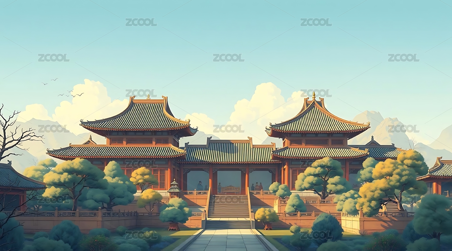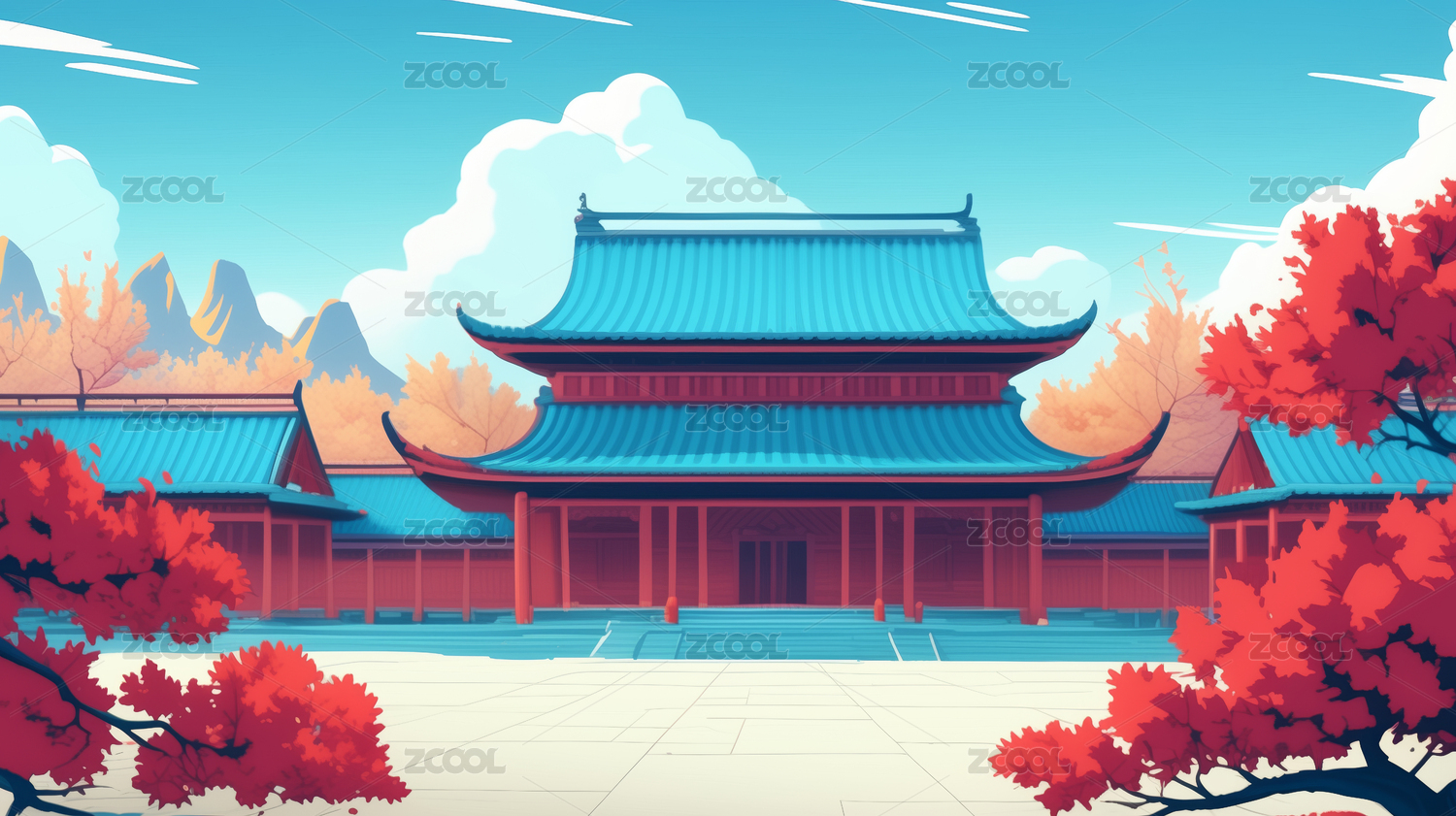 中国风古楼建筑传统国风古建筑国潮插画背景