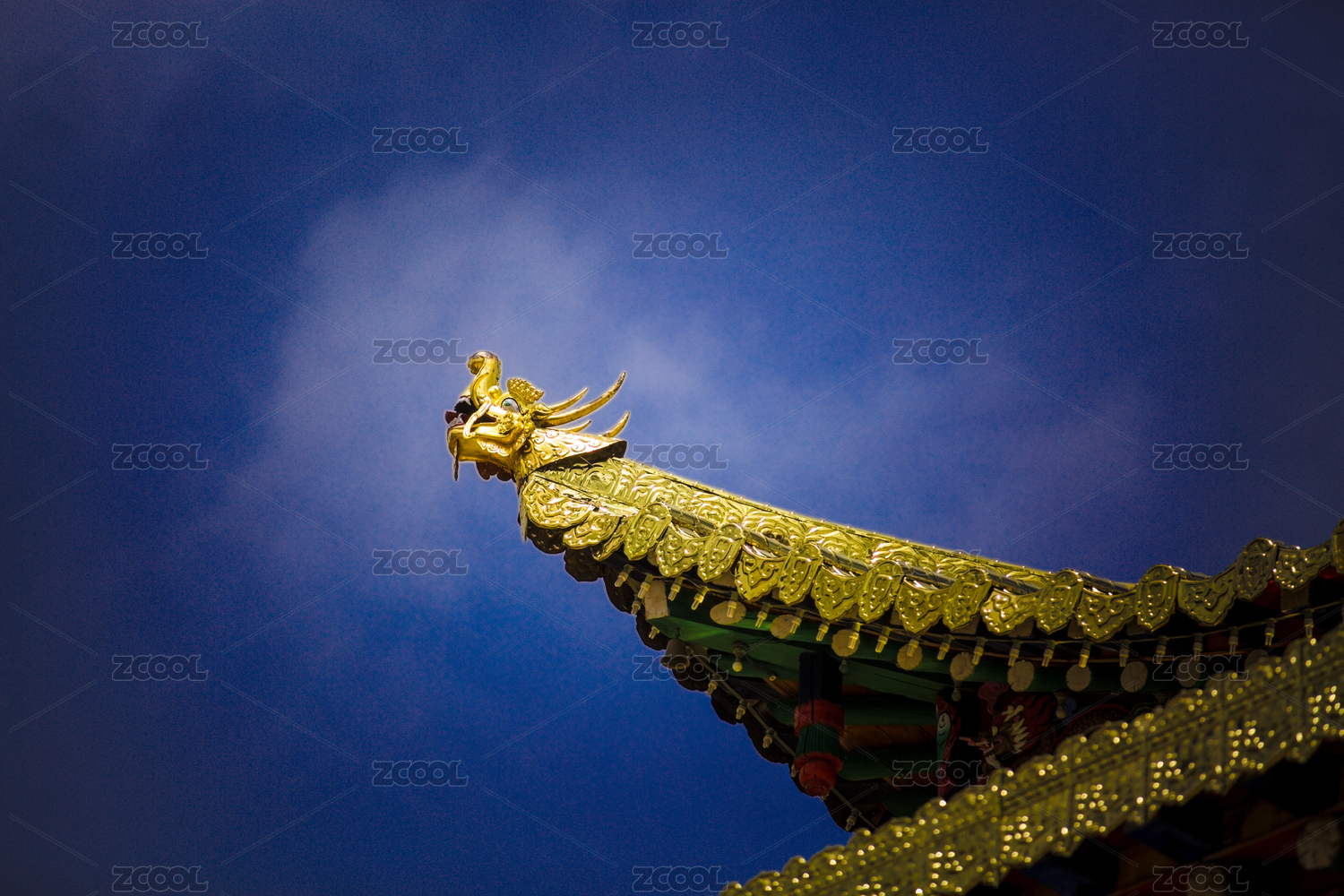 中国西藏拉萨大昭寺建筑的龙型的飞檐