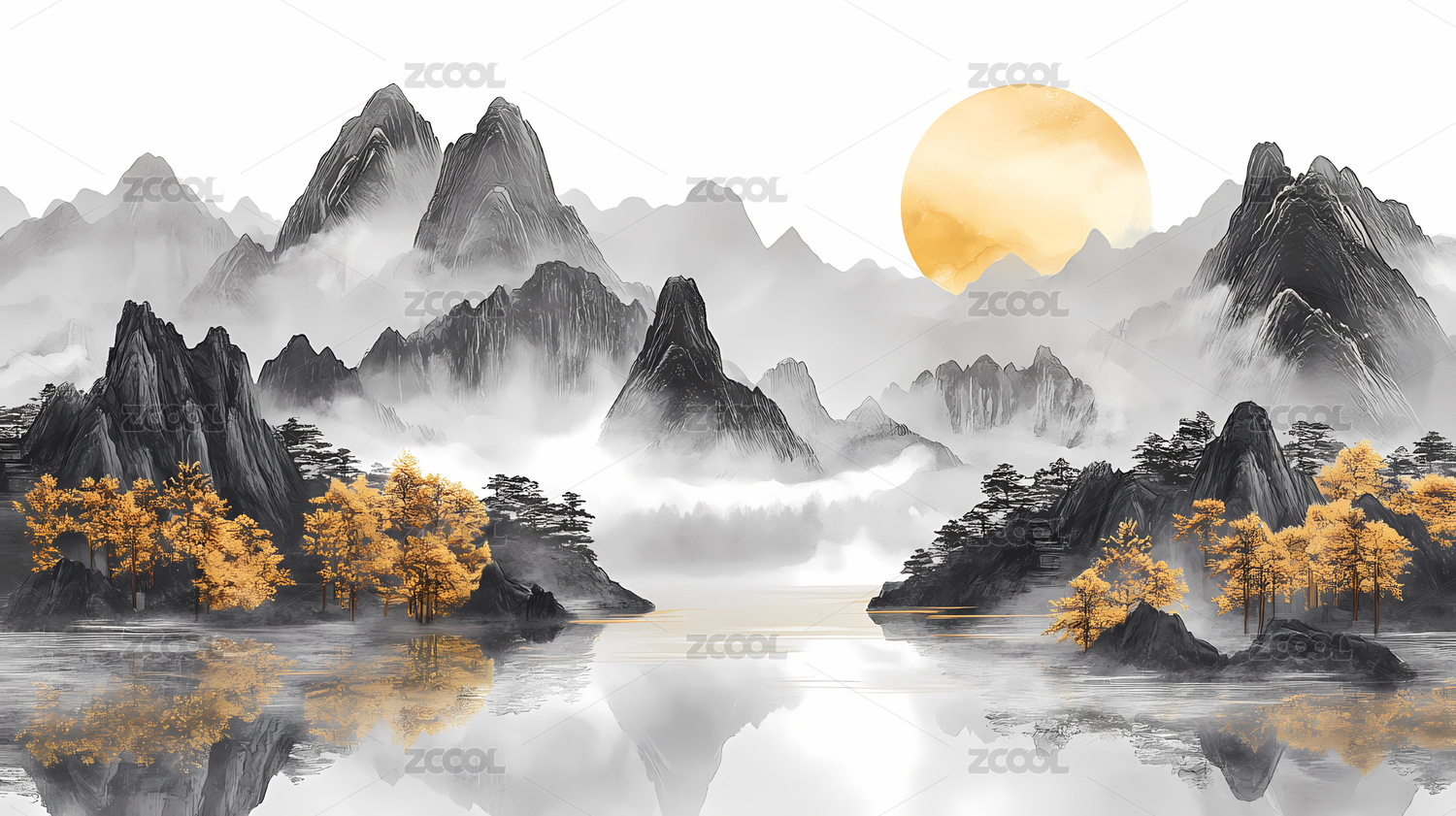 秋天,黄叶,山水,背景图,平面图,中国风,水墨画