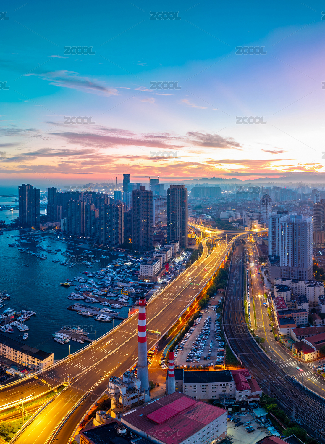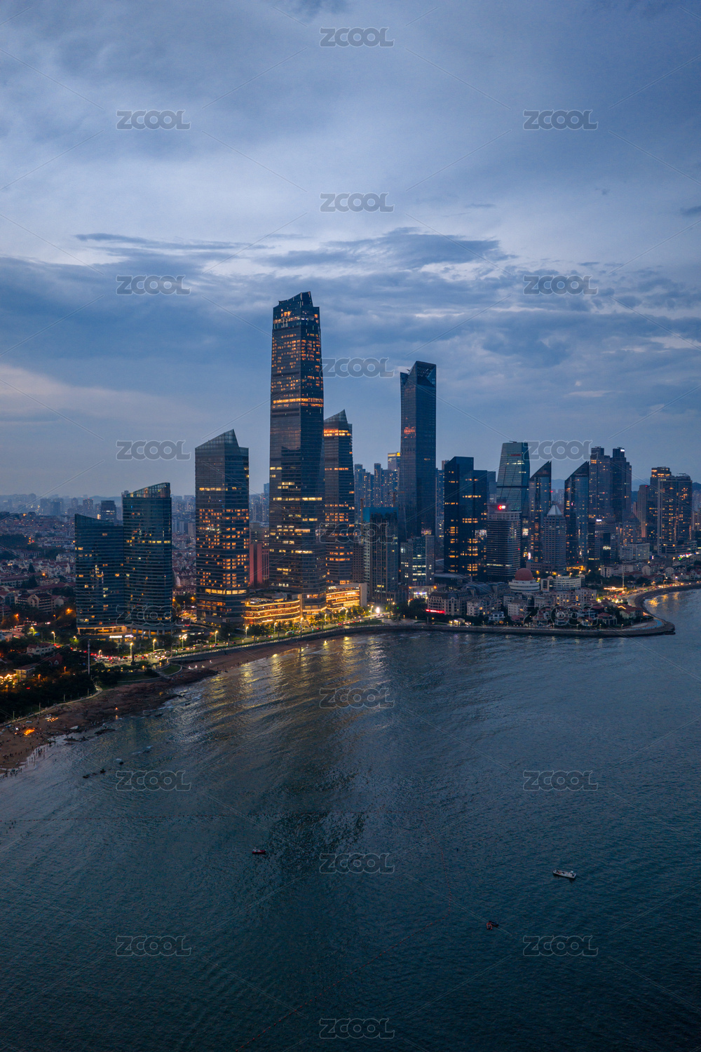 山东省青岛市海边城市建筑日落夜景风光