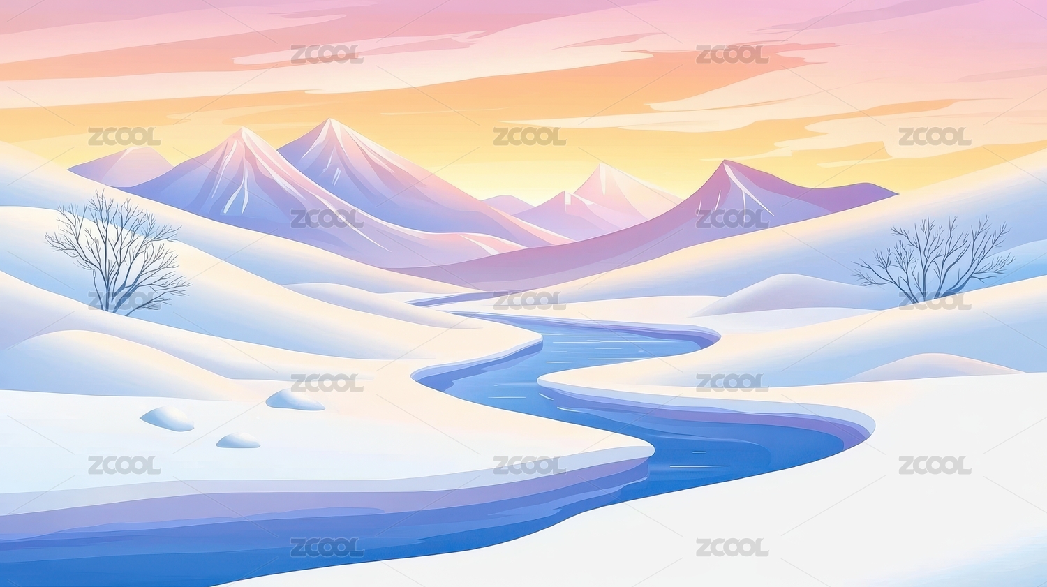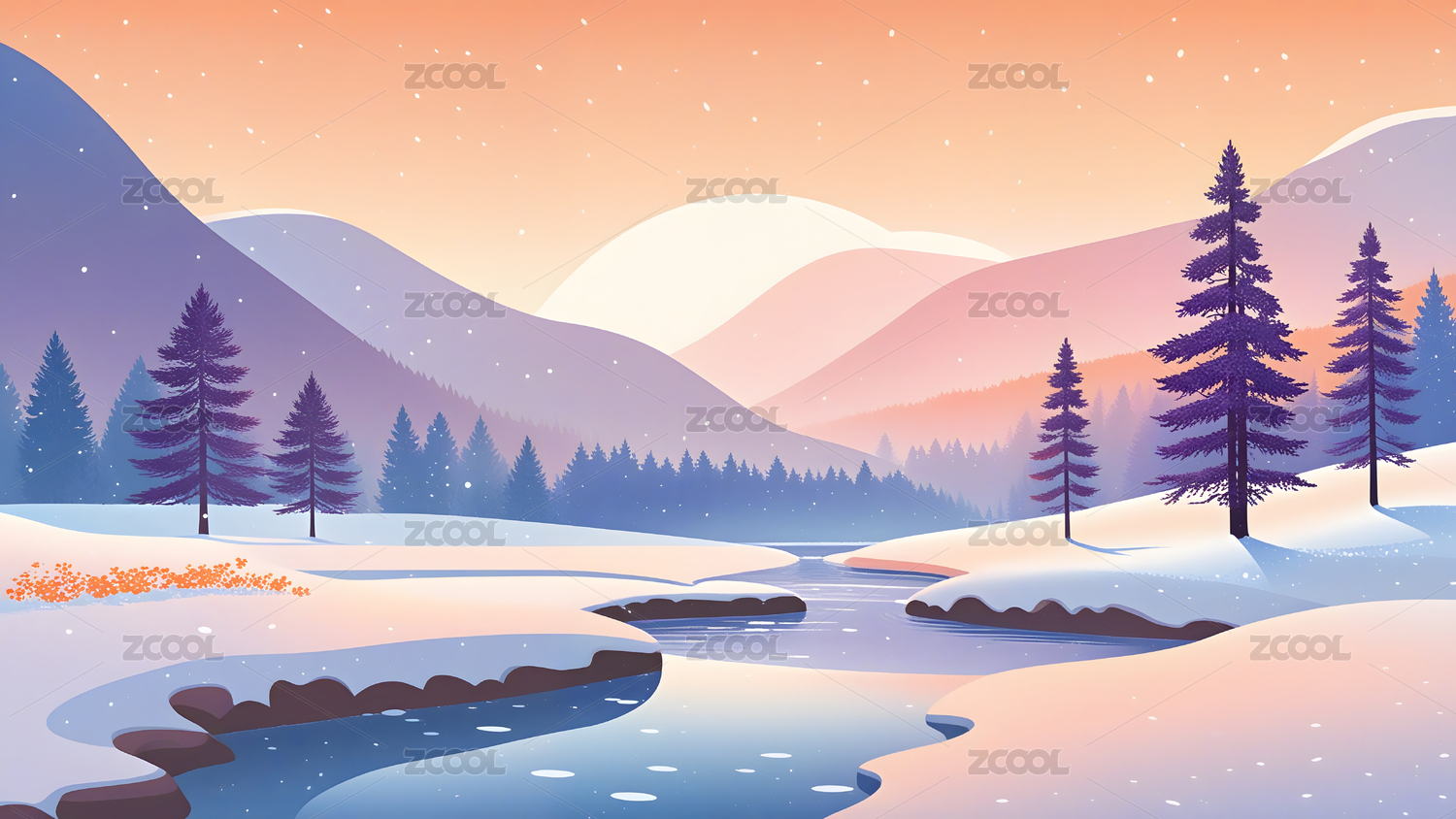 冬季大雪节气插画,雪景中的冬天河流场景插