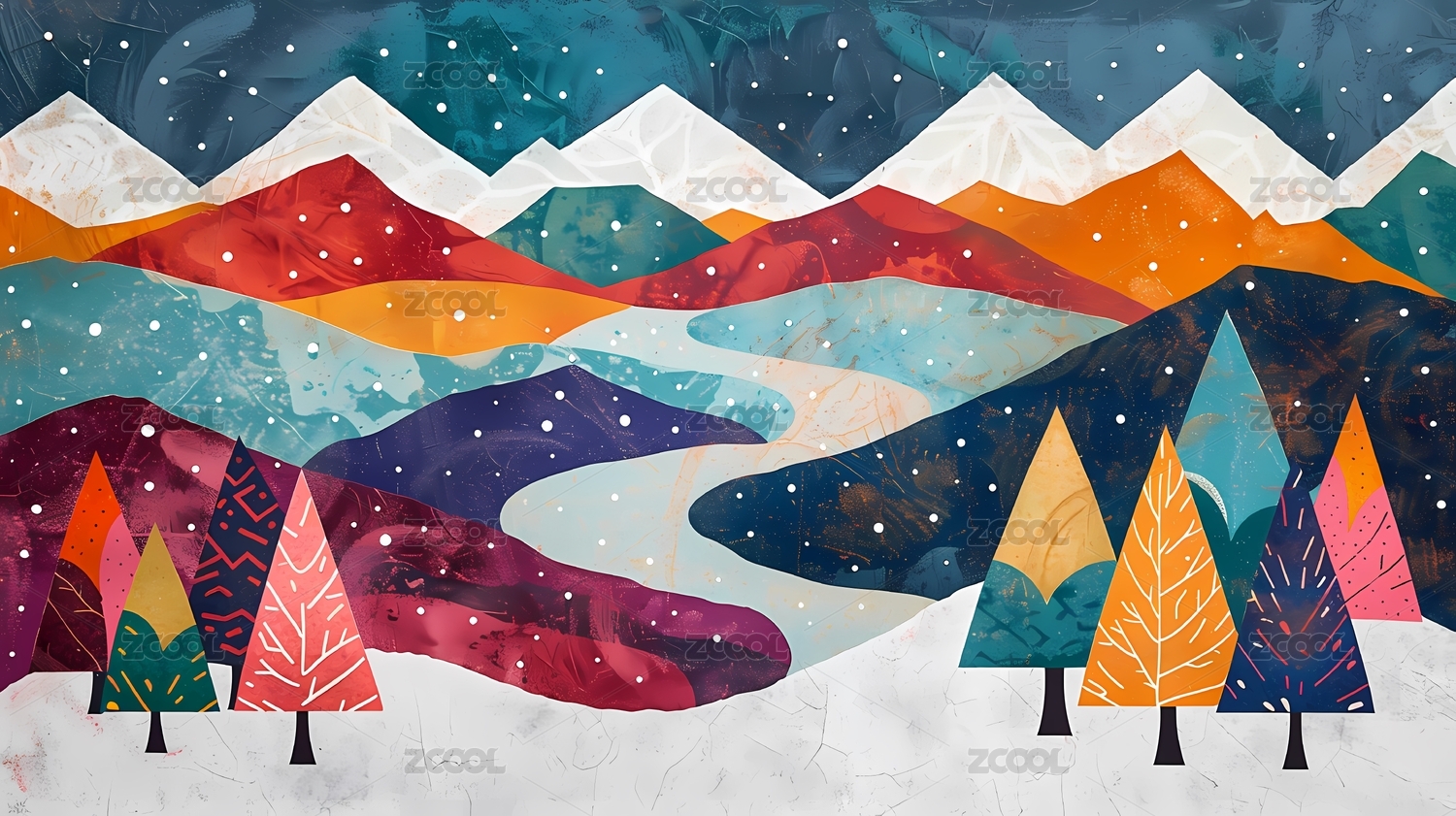 冬季,山谷,河流,雪景,树木,彩色,抽象,艺术,绘画,山脉