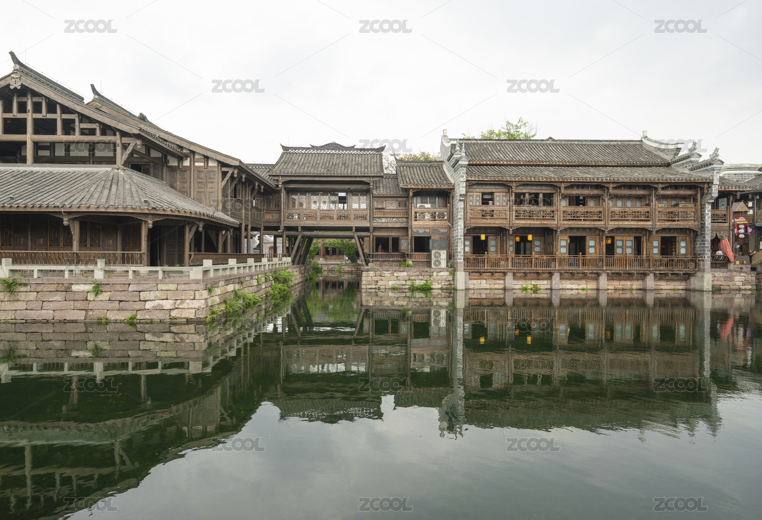 四川宜宾李庄古镇木结构青瓦房水面光影