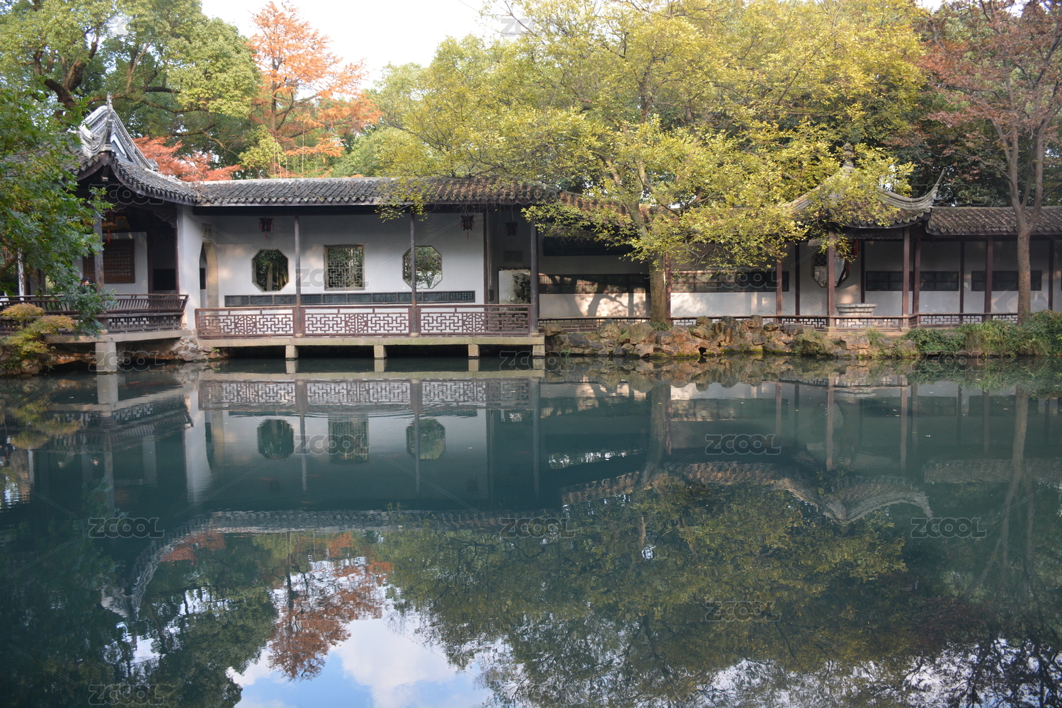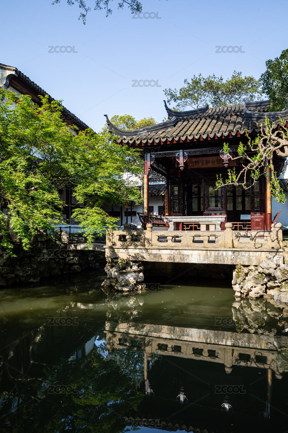 春天中国苏州沧浪亭外面的古建筑与河流绿树