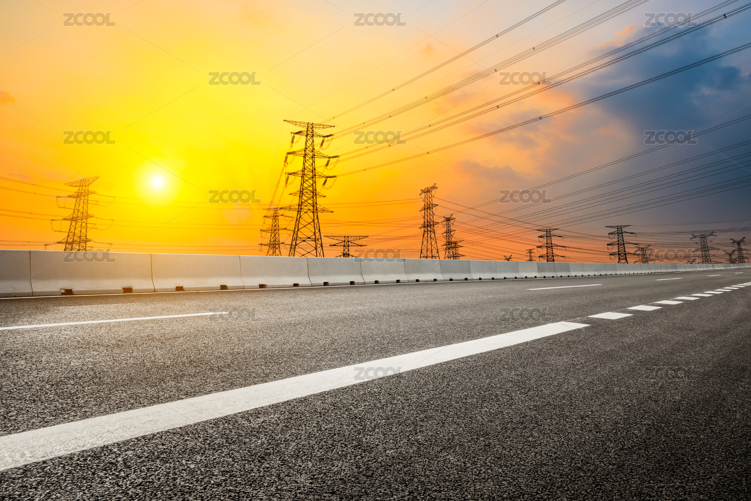 亚洲空的沥青路面和高压电力塔在日落时刻