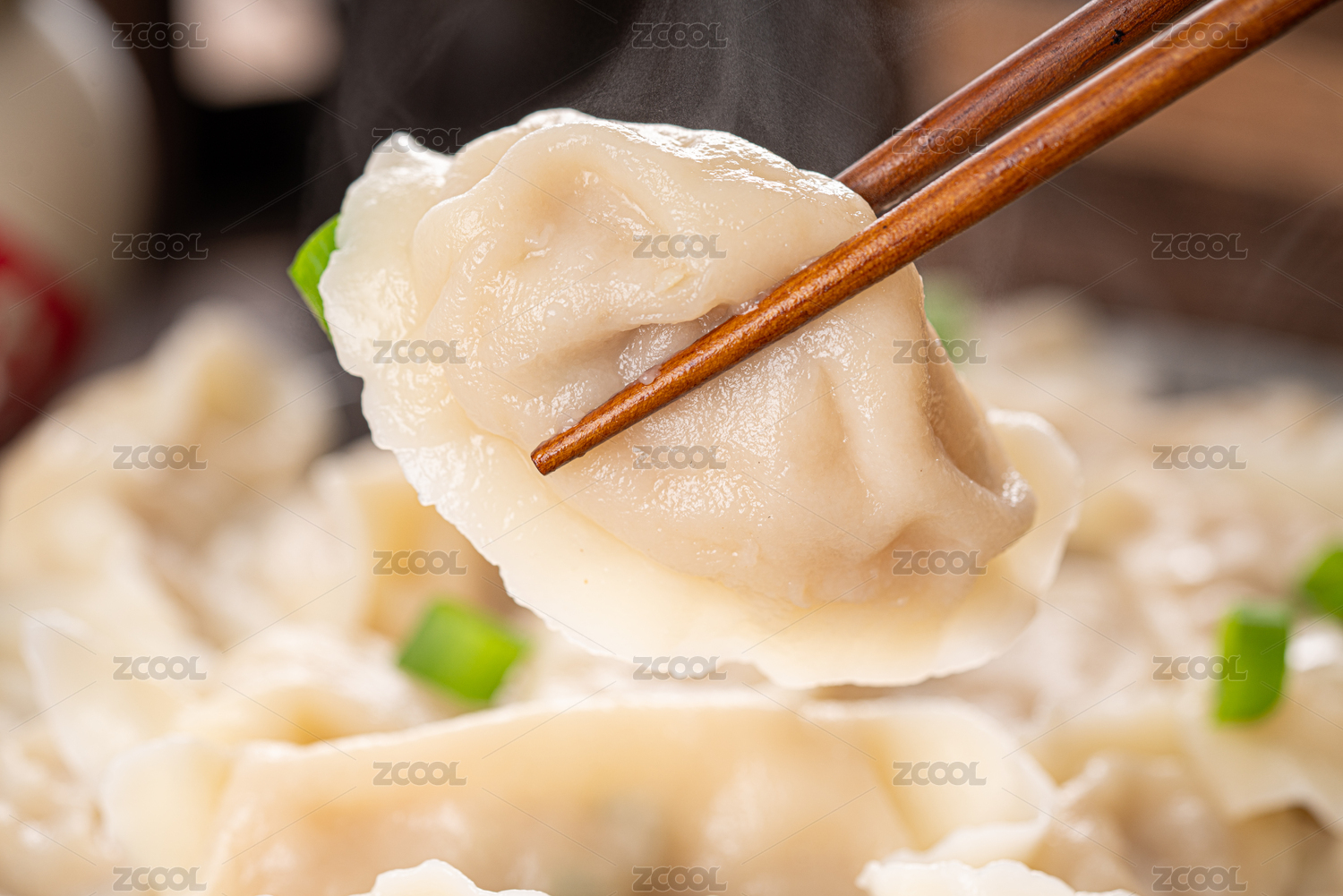 一碗馄饨摆放在木桌面上旁边放有卤蛋拌黄瓜